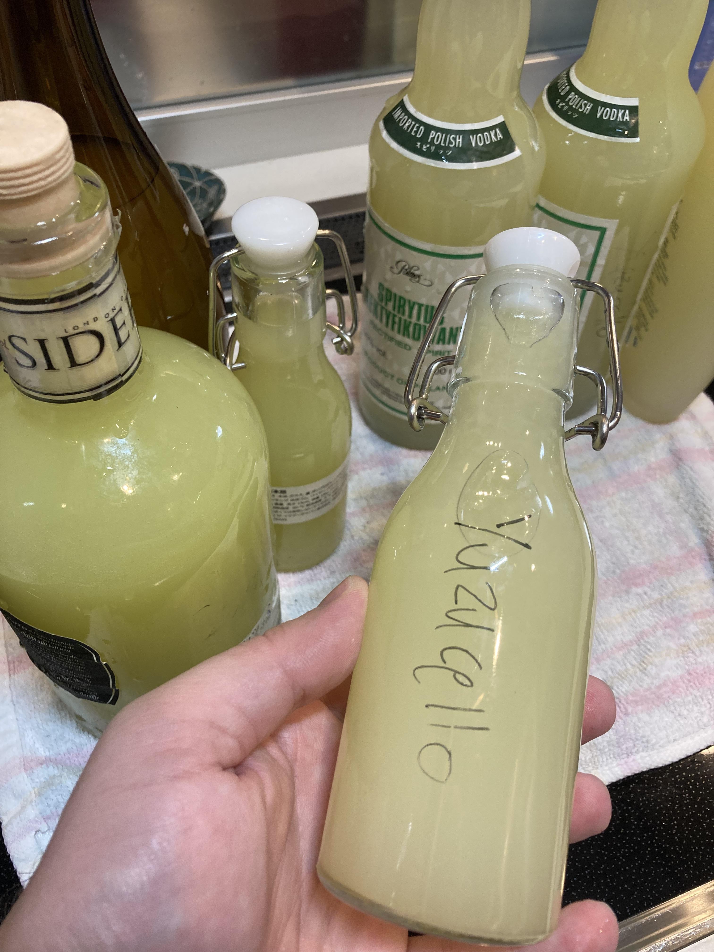 I followed some tips around here and did 24 hour soak in 500ml 95% vodka (you see the bottles reused for the limoncello), then added 1L of distilled water and 500g of white sugar. That’s it! One of the bottles also has the little bit of yuzu juice added, which I could squeeze out, just to try if that’s a good idea.