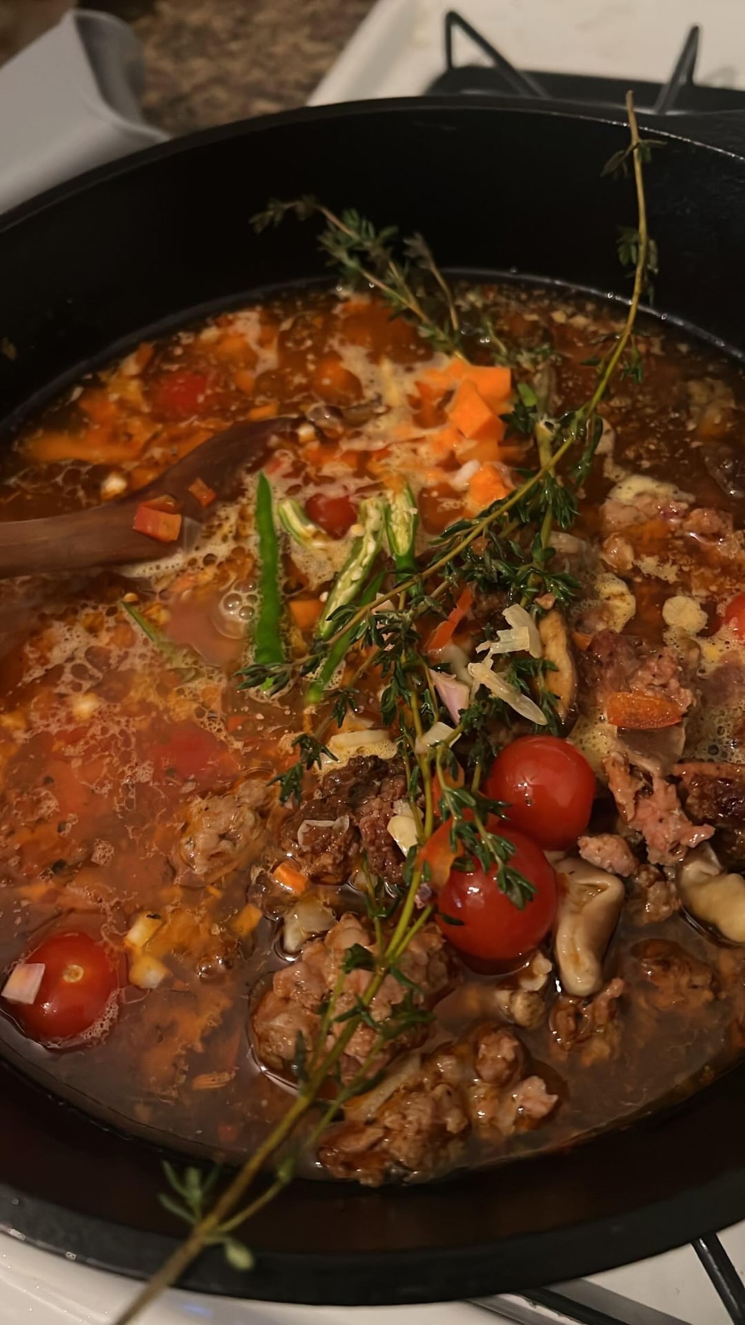 shiitake carrot red pepper shallot garlic thyme sherry vinegar sambal oelek chicken stock Italian sausage San Marzona flavortown cherry tomatoes parmigiana reggiano gochugaru garlic powder oregano pepper 3 thai peppers honey evoo sauce