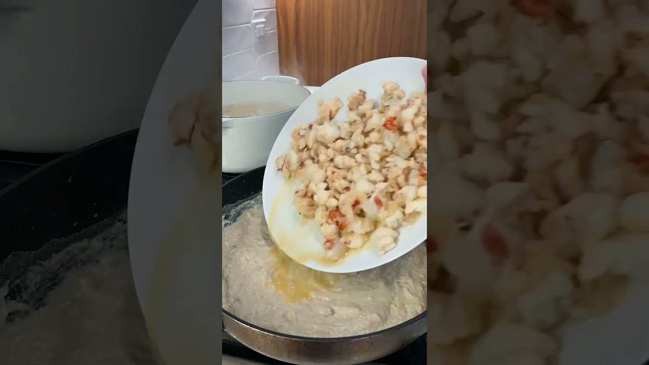 Begin by removing meat from lobster tails, then roughly cut and set aside. Next melt two tablespoons of butter in a large pan over medium heat on stovetop. As butter melts add six cloves of minced garlic, cook just until garlic becomes fragrant. Once garlic is fragrant, add lobster meat and lightly poach. It’s very important here to only lightly poach the lobster and immediately remove from pan to a plate to avoid overcooking. Set aside