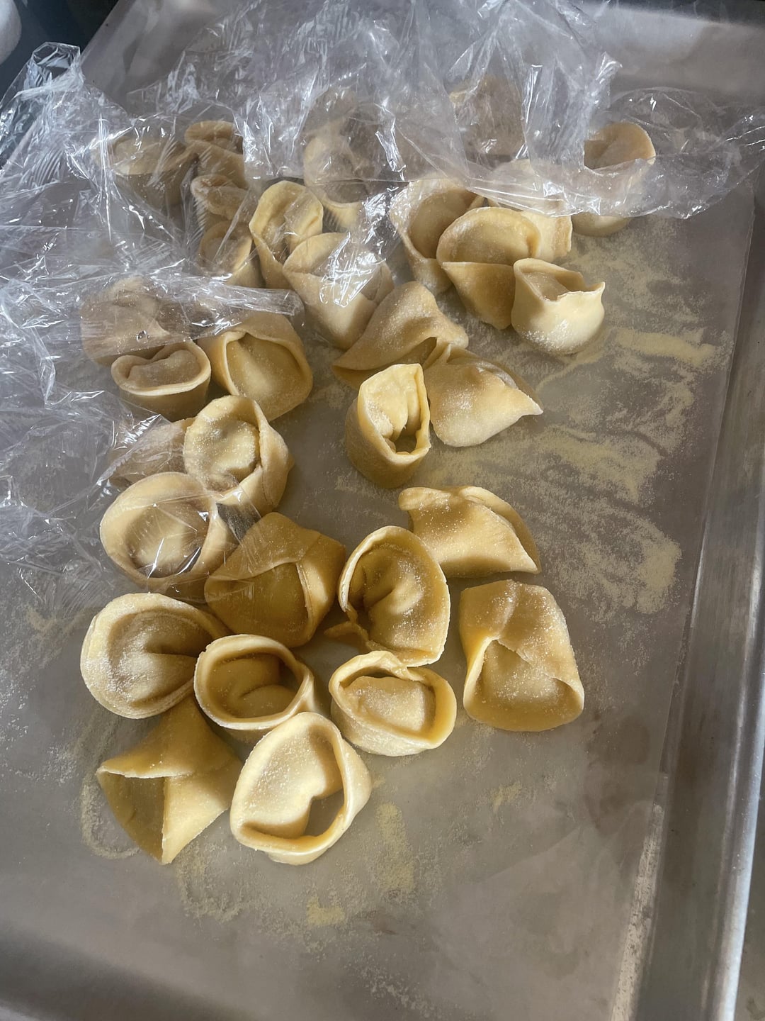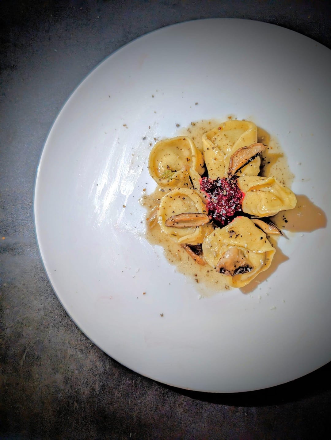 Day of – finely shred duck and add Parmesan and some of the reserved fat solution to use as filling – rollout pasta and form tortellinis with duck – finely slice shiitake mushrooms and fry in olive oil. – add white wine to deglaze and then reserved duck fat from the confit to the pan – cook and add tortellini with tons of black and white pepper – serve with a dollop of jam and spoon the sauce over the tortellini