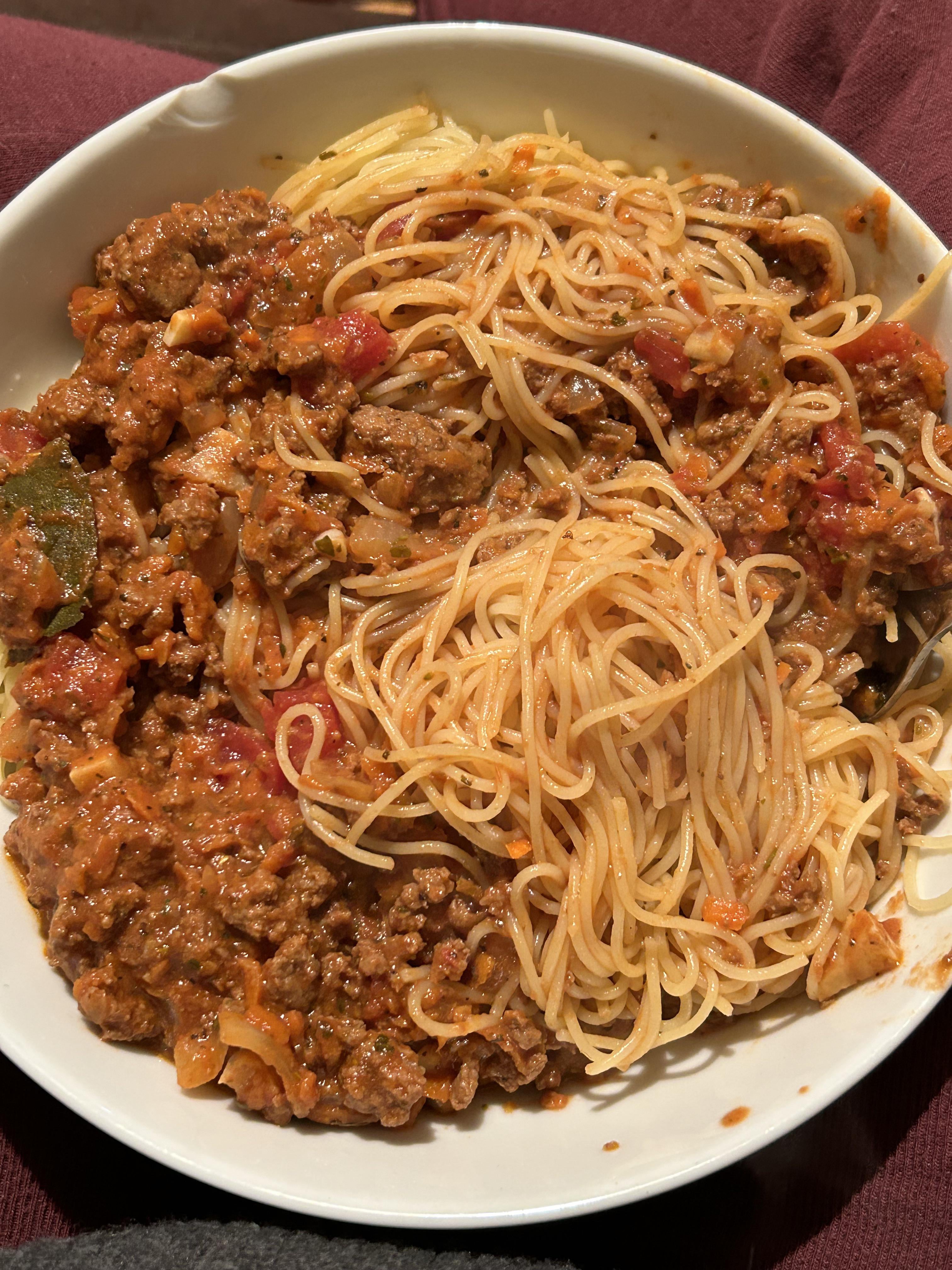 I browned ground beef in a pan, along with onions and a little olive oil. I added grated carrot, heavy handed Italian seasonings (whole and ground), a can of tomato paste, a chopped can of whole tomatoes, finely chopped garlic, splash of milk, and a healthy amount of salt and pepper. Simmer for 1 hour on medium low. Toss with angel hair with a little pasta water. I topped with fresh Parmesan after taking this imags