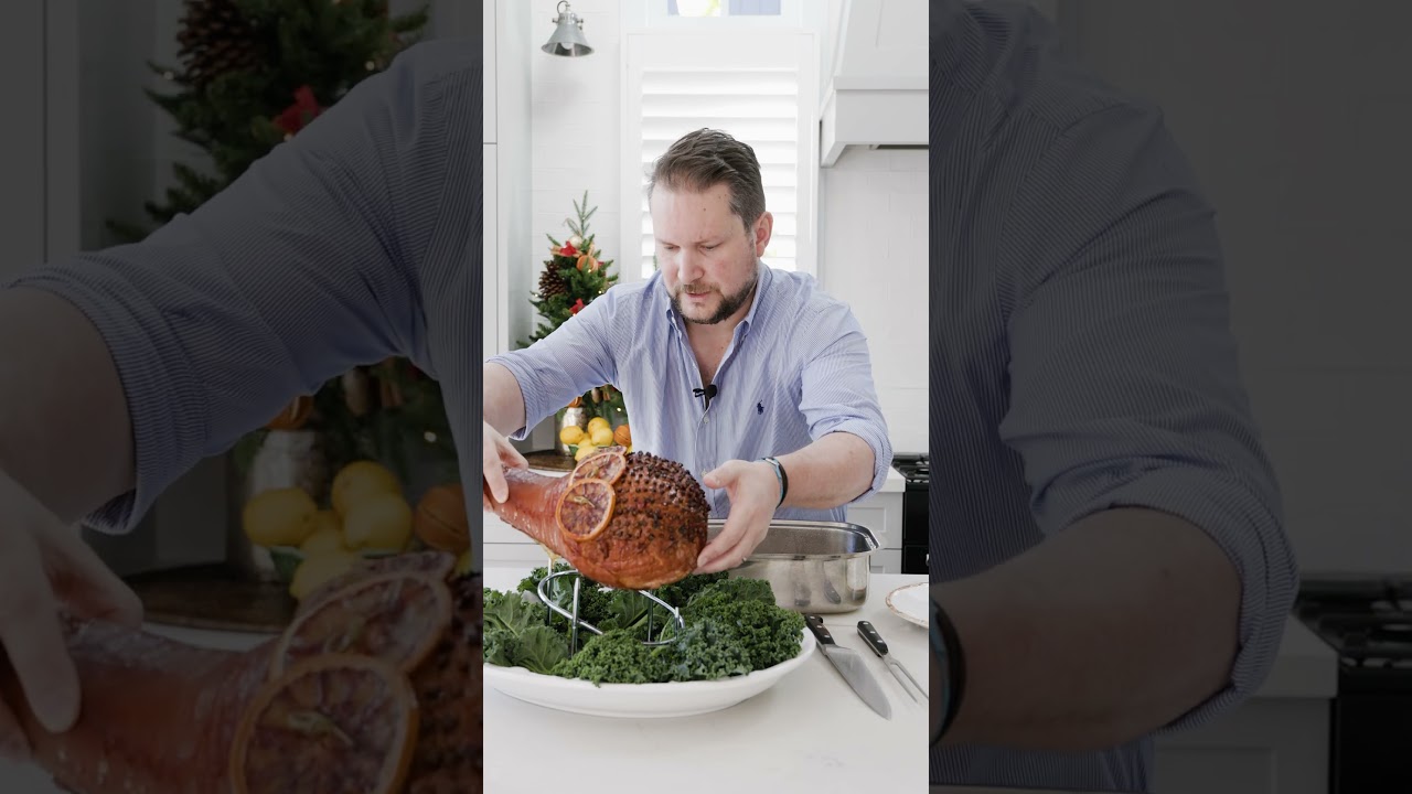 Discover our tips for presenting your gourmet ham centrepiece. Begin by crafting a nutritious green base that surrounds an exquisite ham stand, following this place your ham in the stand with the leg at the top, and complemented with decorative elements for a festive crowd-pleasing display.