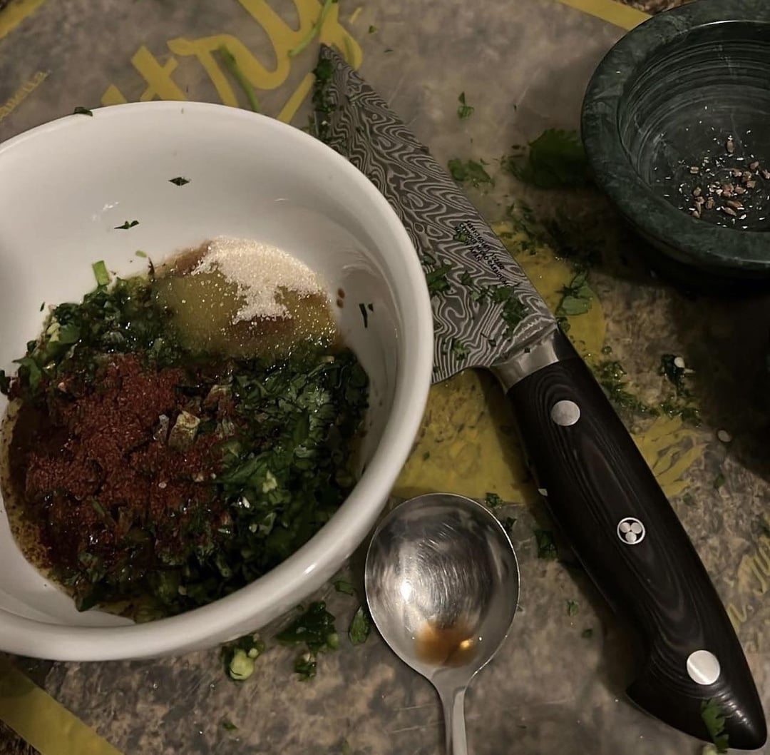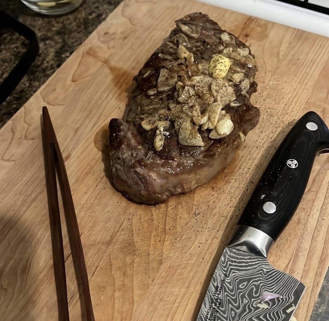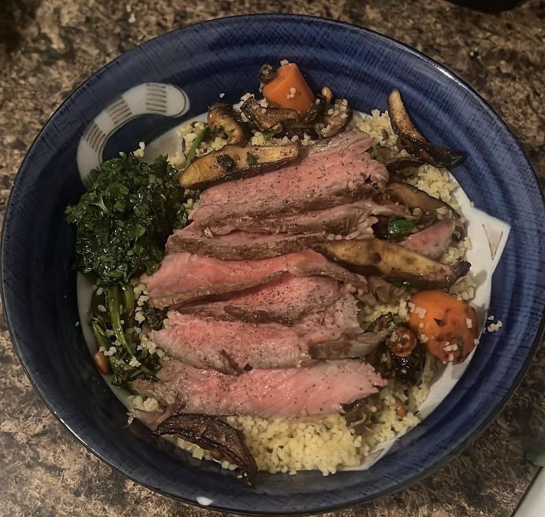 Leftover ny strip thinly sliced with couscous and honey garlic butter carrots, shiitakes, and dates cooked with coriander, cinnamon, sumac, maple sugar, sherry vinegar, and kerrygold butter with toasted pine nuts, habanero schug and roasted broccolini