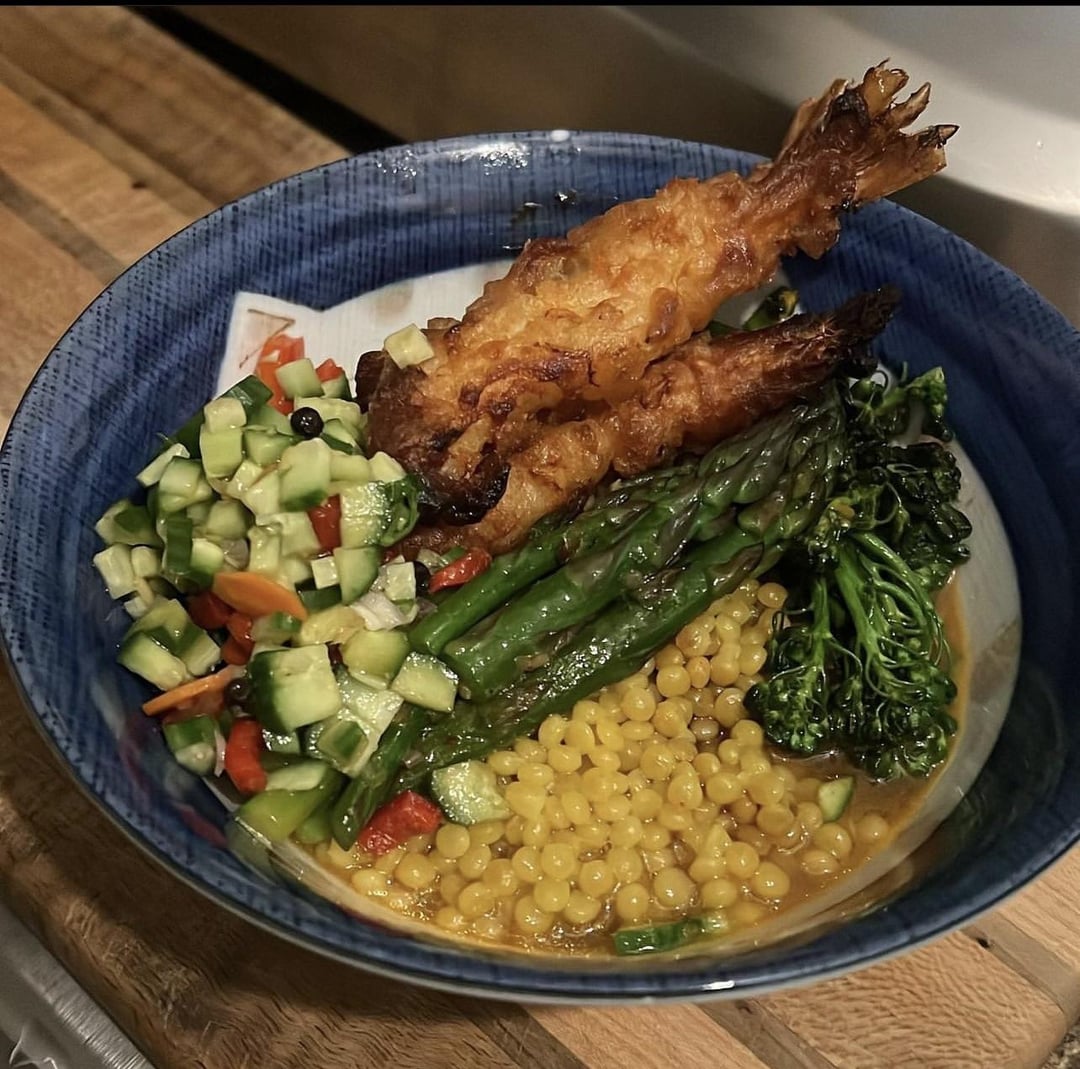 Tempura shrimp with couscous cooked in garlic, shallot, evoo, chicken stock, butter and sautéed asparagus, broccolini, shallot, and garlic with gochujang, honey, kerrygold butter, coriander, gochugaru, chicken stock, fermented peppercorns, maldon salt, and 15yr balsamic with leftover yuzu marmalade rice wine vinegar sesame oil fermented peppercorns cucumber red pepper carrot slaw and diced up sautéed asparagus stems under the couscous for next level texture