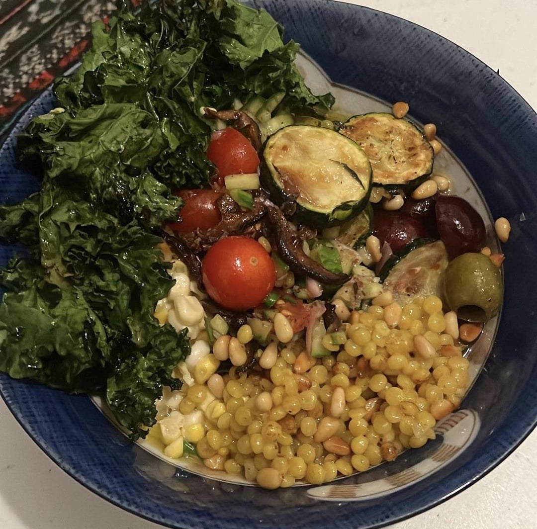 Sautéed zucchini, castelvetrano olives, shallot, lemon peel, and cherries cooked with thyme, balsamic vinegar, honey, and isigny butter with a sautéed shiitake Persian cucumber, fermented peppercorns, flavortown cherry tomatoes, shallot, lemon zest, lemon, thyme, sumac, evoo, sherry vinegar, honey, Thai peppers slaw with cheesy corn cooked with shallot, garlic, heavy cream, 13yr cheddar, sherry vinegar, honey, and air fried kale and garlic with pearl couscous cooked in chicken stock, garlic, isigny butter and garnished with toasted pine nuts, sumac, and cinnamon