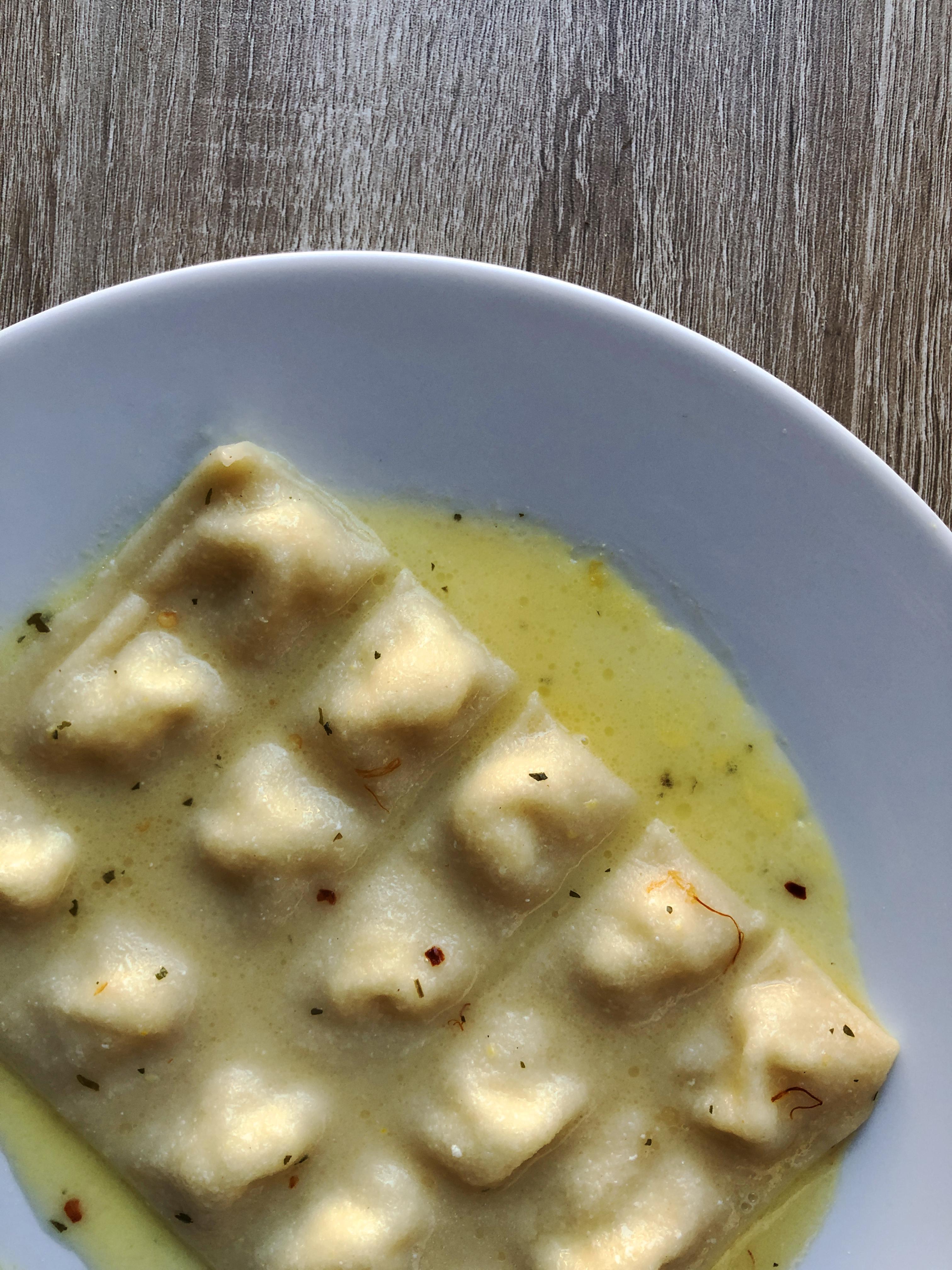 Roll out manageable-size sheets of dough – not too thick, not too thin. I go on setting n4 on my machine. Put the filling in a piping bag or something that will do the trick – for instance, you can use a freezing bag and cut the tip. Add a bit of filling in a grid manner, leaving the space between each little mound to seal each raviole. When this is done, layer another sheet of pasta on top and seal it with a chopstick for each line and column of your ravioles sheet. Finally, trim the edges.