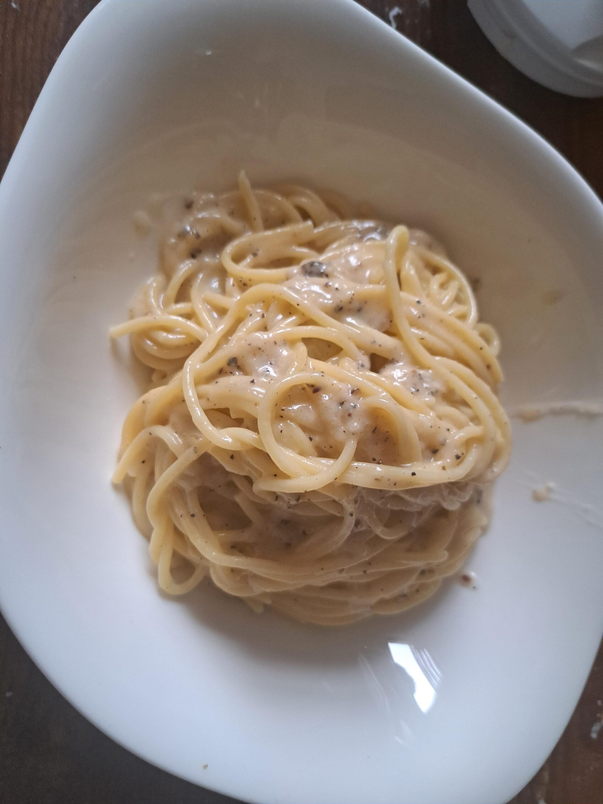 Recipe: roast black paper, add cooked pasta and slowly add water. Whisk pecorino with hot water separately until creamy. Turn off the heat, add pecorino cream.