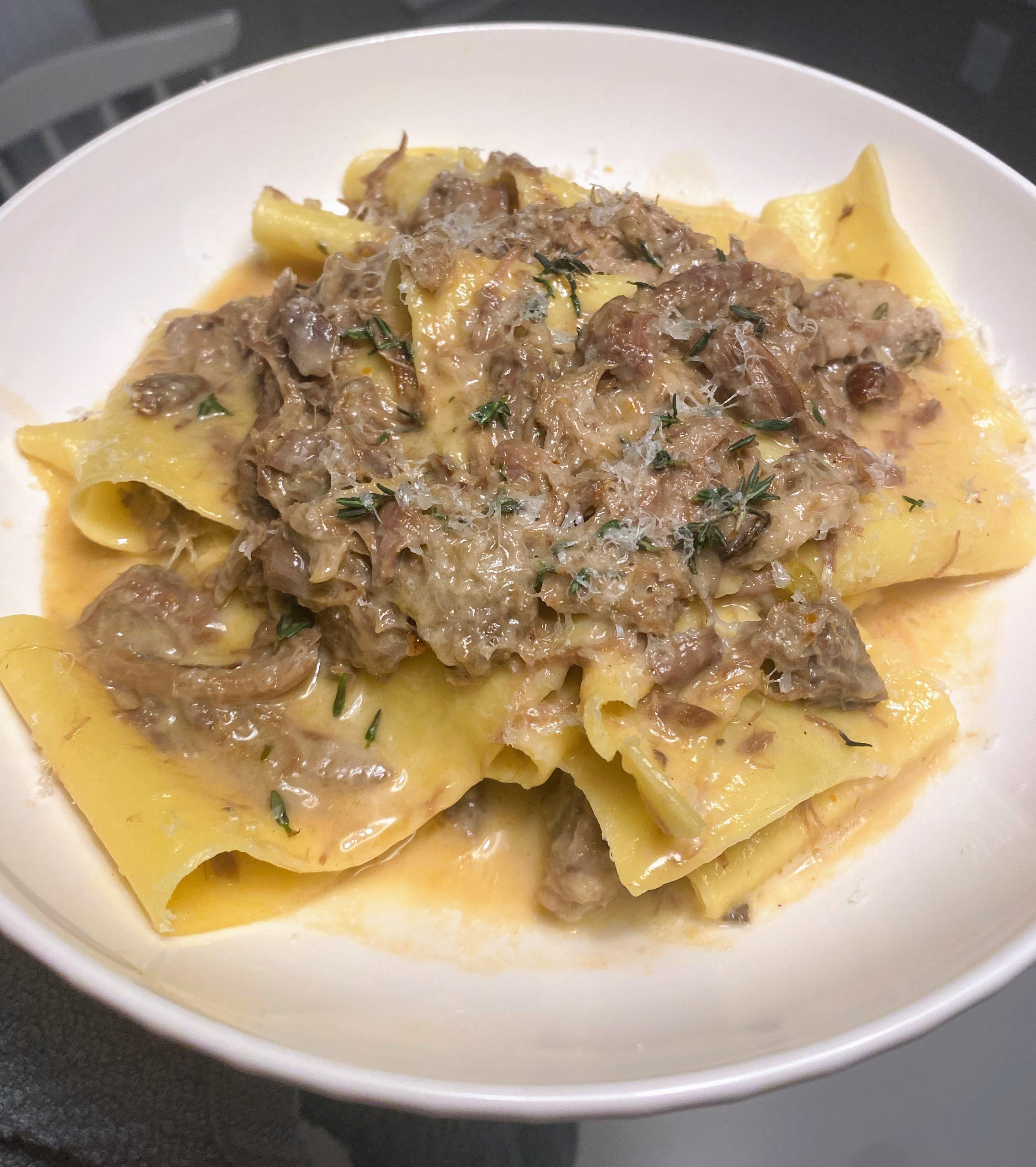 Homemade parpadelle. The lamb was braised for 6hours in a medley of mirepoix and homemade stocks (chicken and veal) I used the liquid from the braising pot for the sauce and reduced (thickened) it and tossed it all together. Any feedback is appreciated