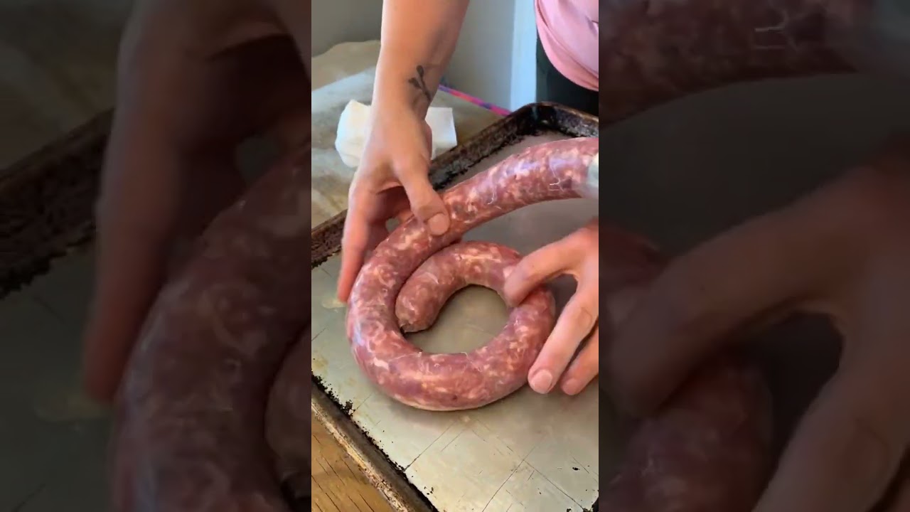 When you get to length of link you want simply pull sausage slightly and cut casing and begin process again until all meat is in casing. Store sausages in gallon freezer bags in refrigerator or freezer.