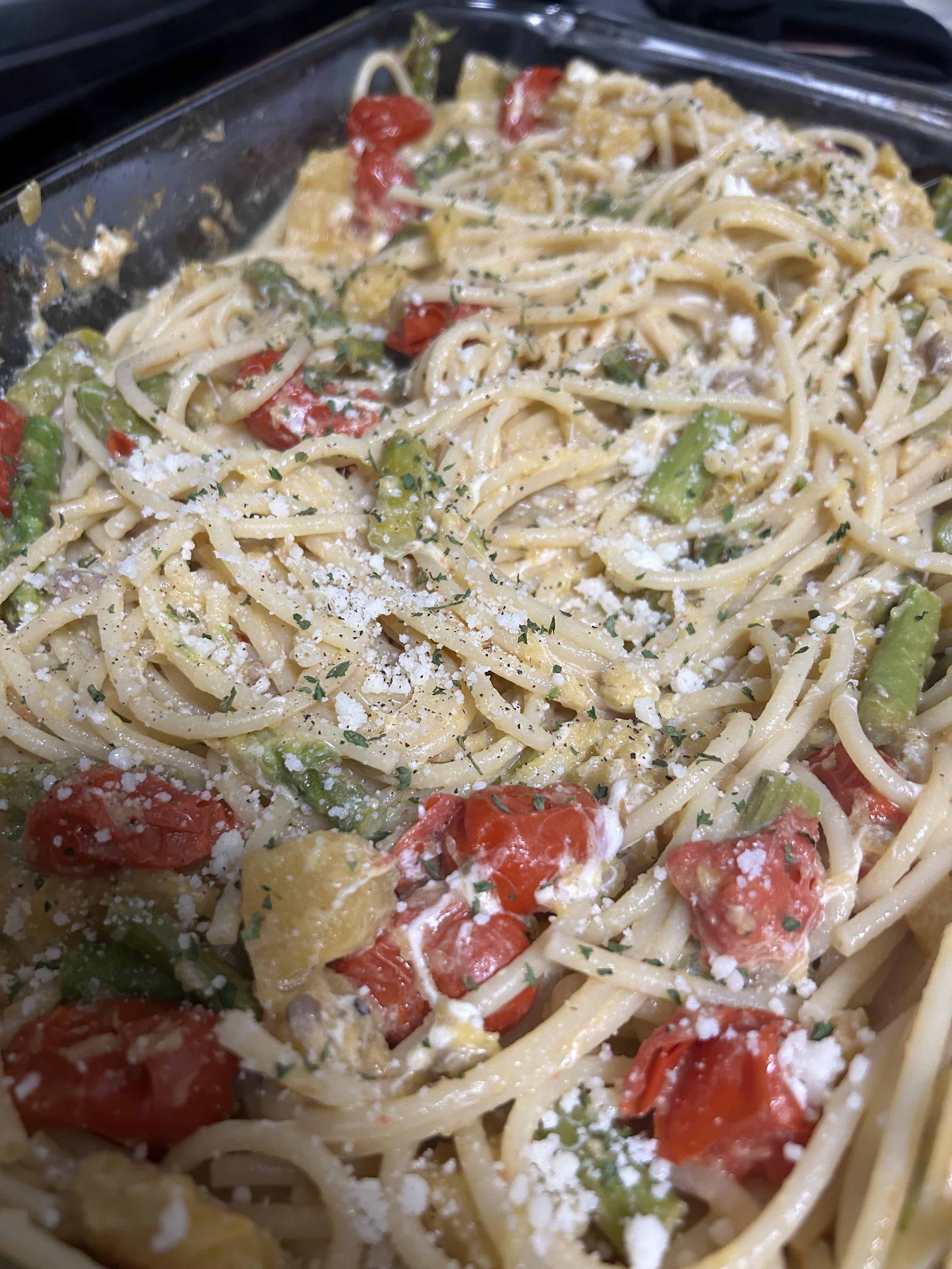 * put the pasta in the baking dish with everything else, add in a little pasta water and a tad more olive oil, mix it well (tongs work best).