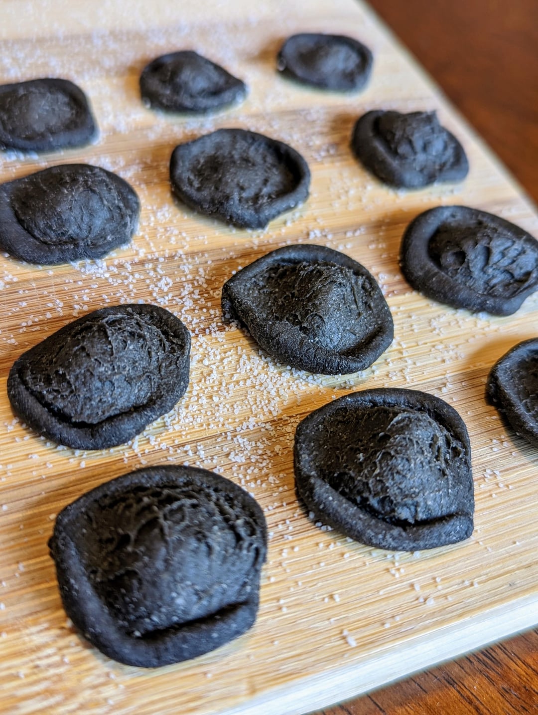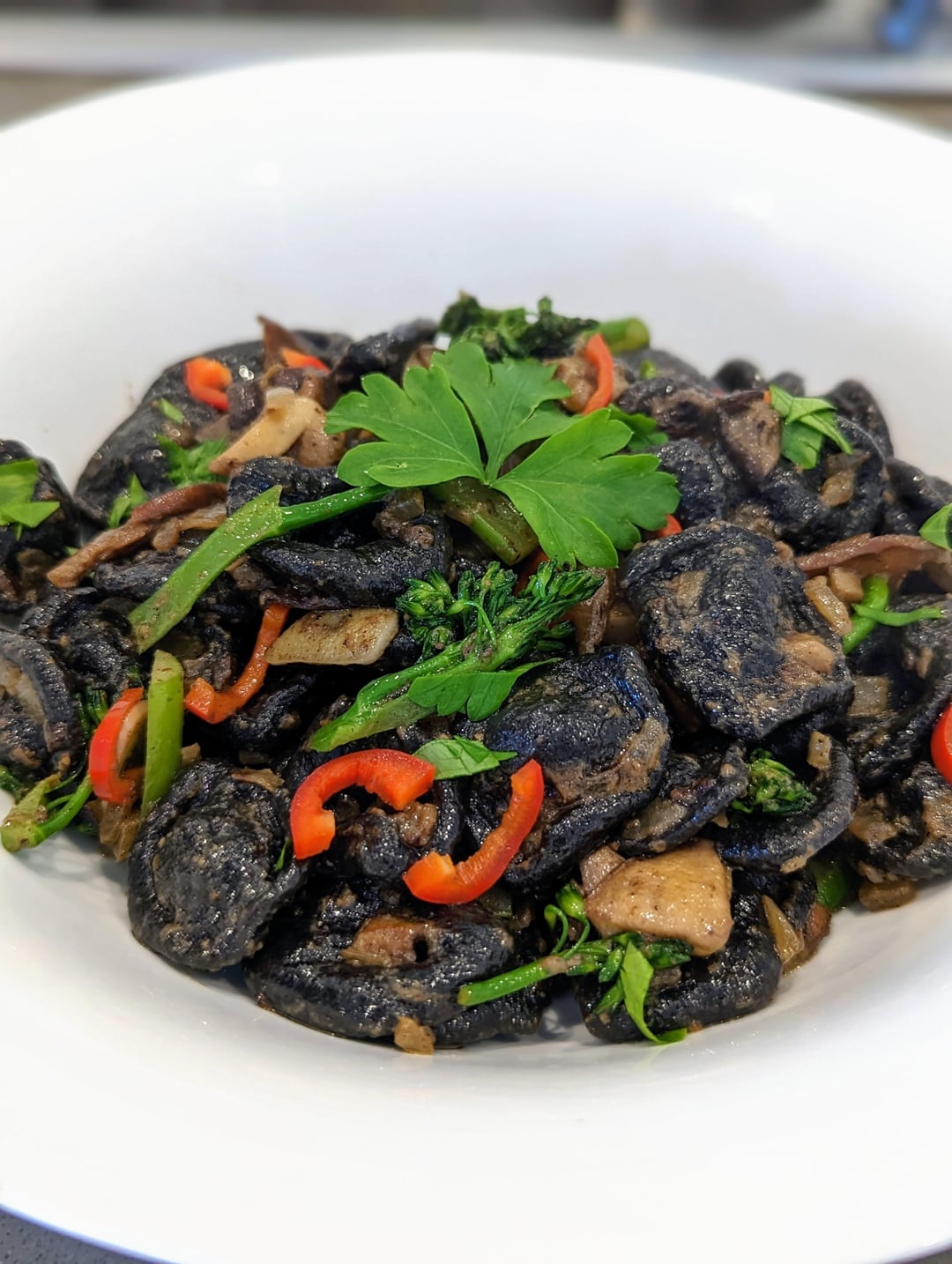 I made these earlier this year during the Australian mushroom season but only just joined this sub and thought you guys might be interested. I collected ink from four large coprinus comatus (shaggy ink caps) and subbed it for the water in a standard gnocchi sardi dough (400g duram semolina, 200g liquid). The colour held through cooking and they had really nice mushroom umami. The ink in the fourth pic was from a test batch using a couple of smaller ink caps, as I forgot to take a pic of the ink I collected from the four mushrooms in pic number three. The finished dish (pic five) used foraged lepista nuda (wood blewits) and lactarius deliciosus (saffron milk caps) along with broccolini, chilli, garlic and parsley, and was seasoned with mushroom salt I made by dehydrating a big batch of suillus granulatus.