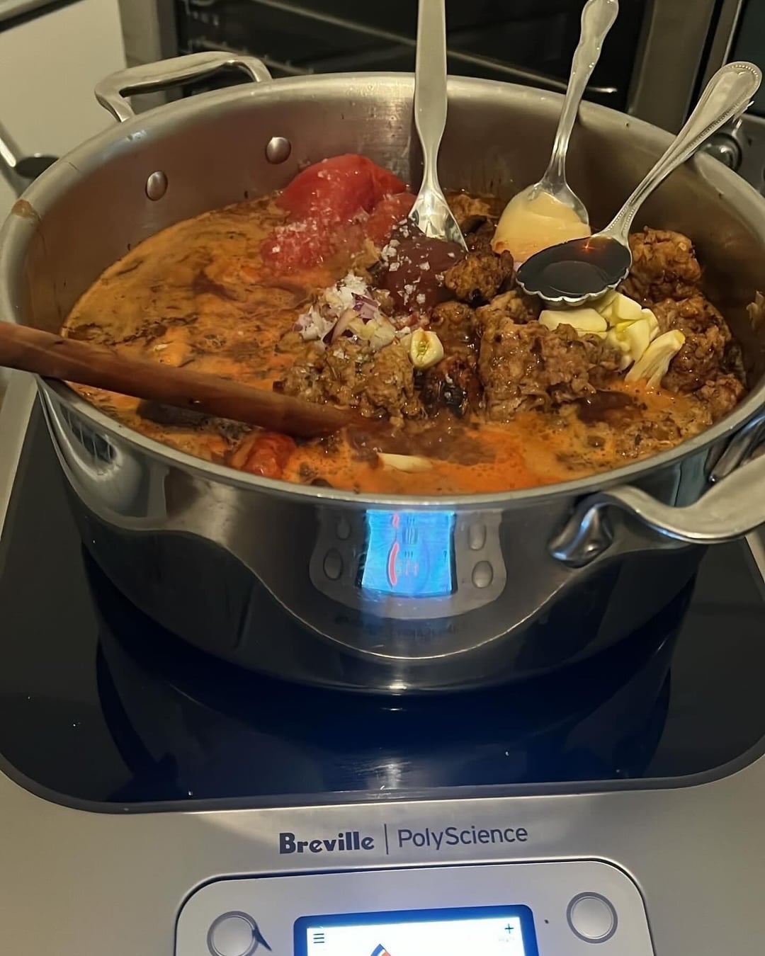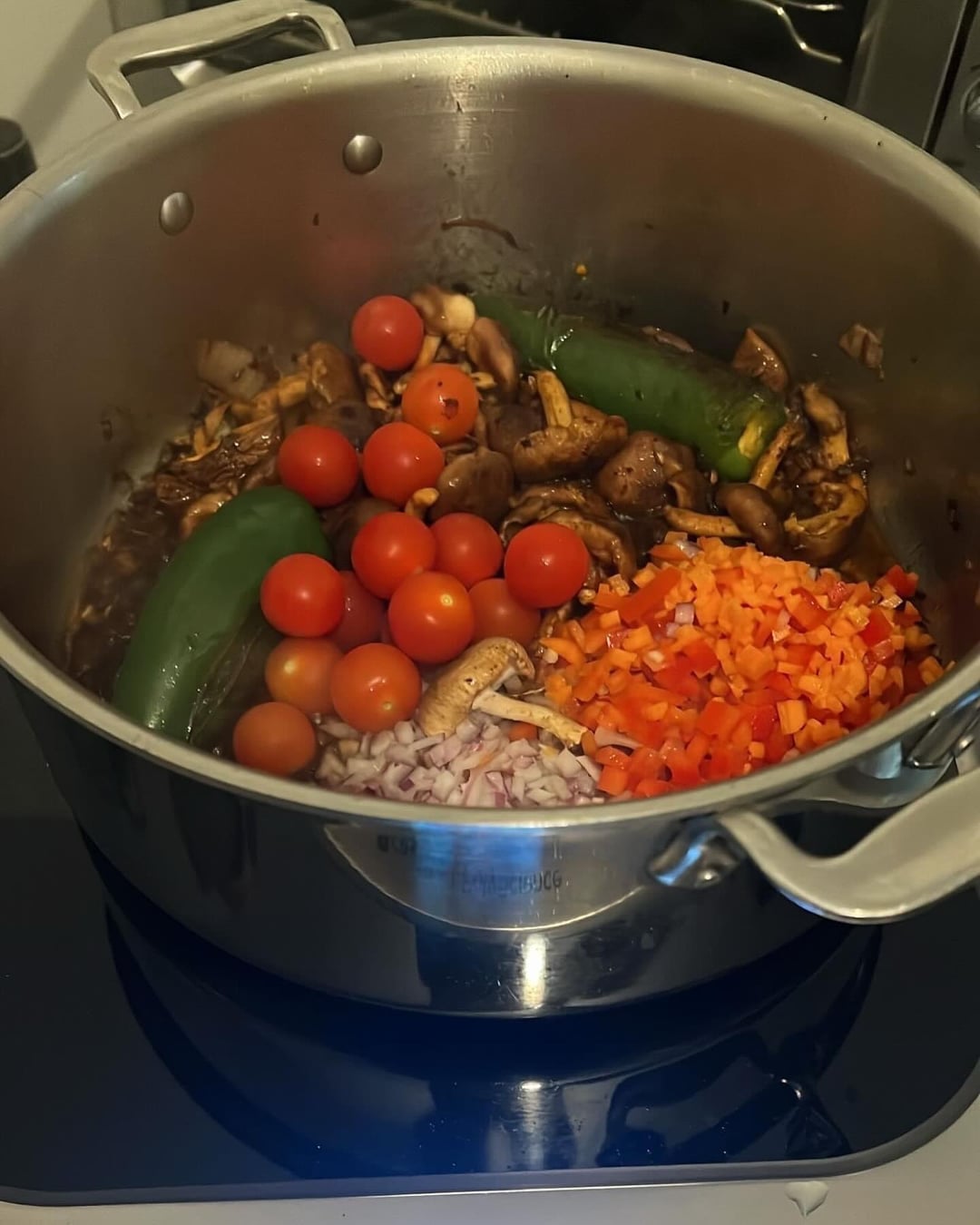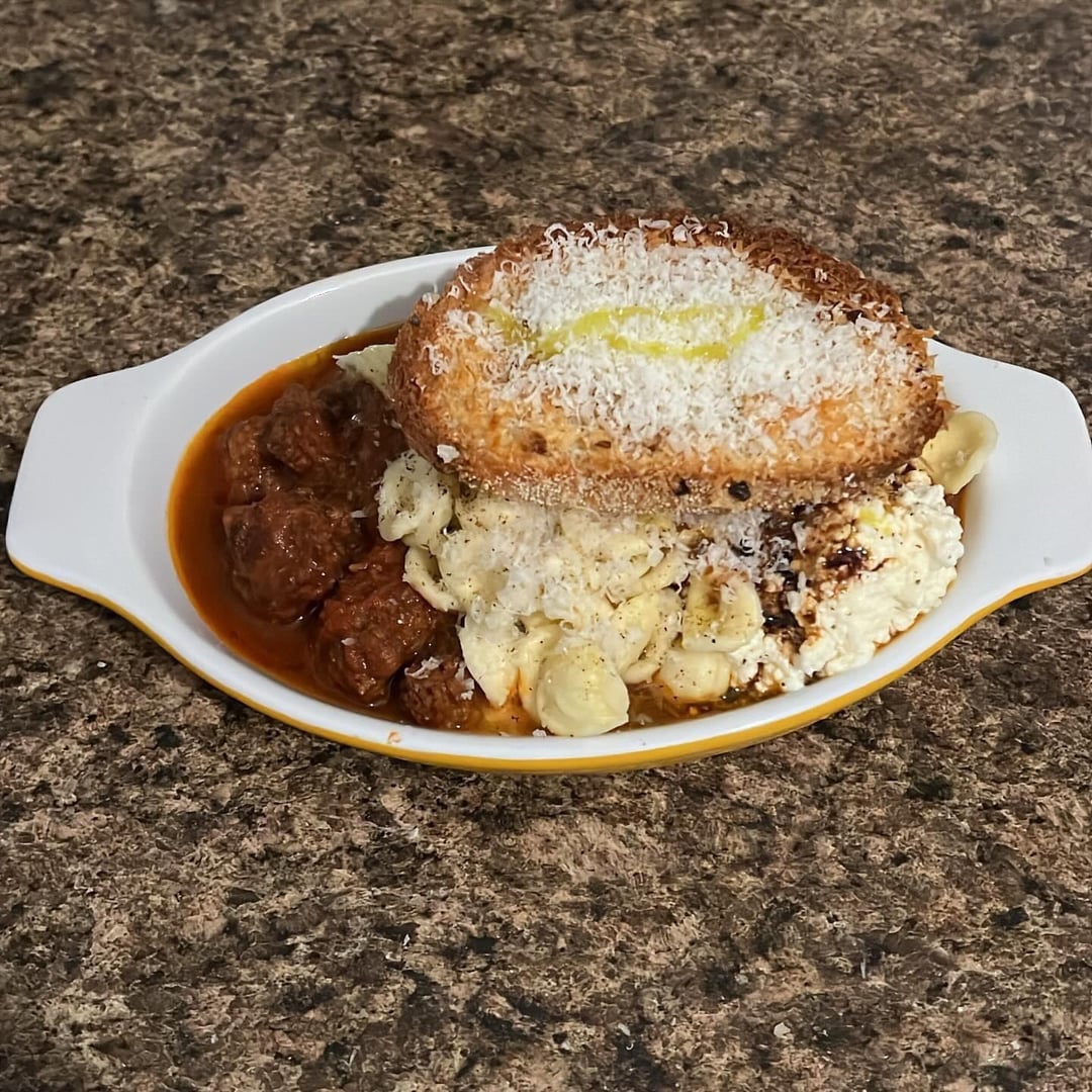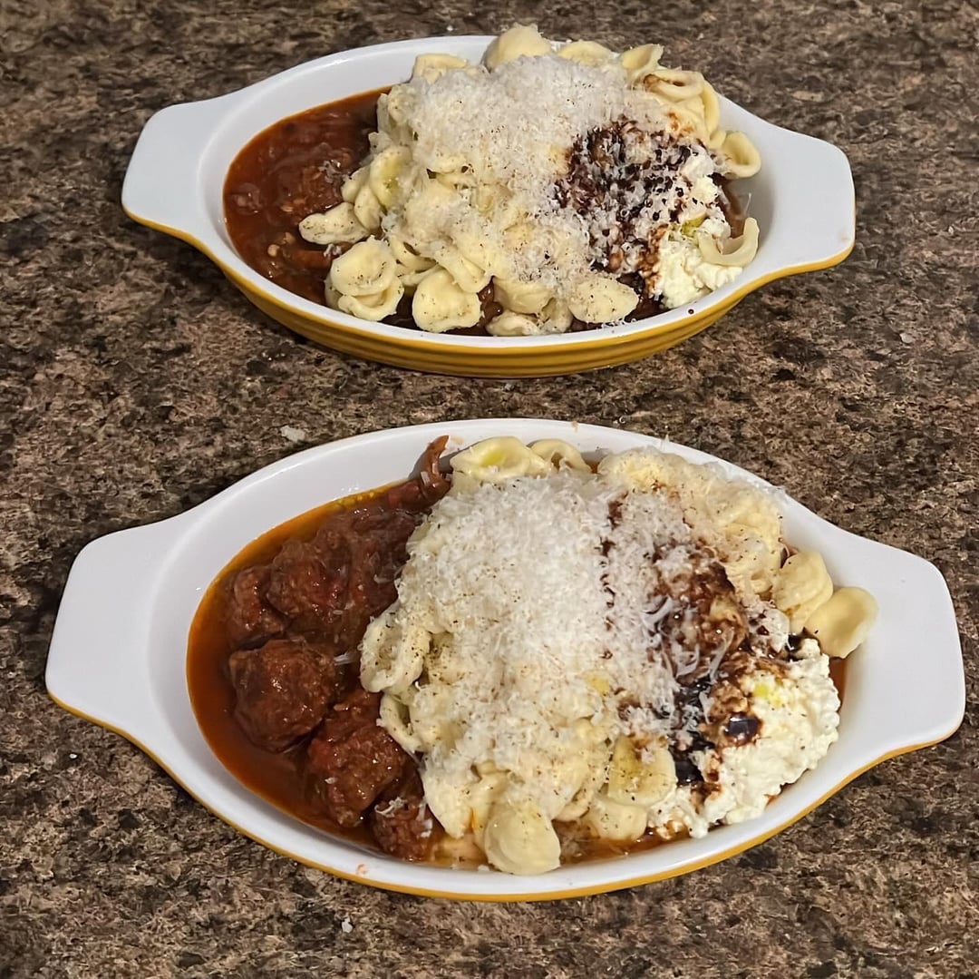 orecchiette pasta with Italian sausage and shiitake San marzona flavortown cherry tomatoes red onion shallot red pepper 2 jalapeños carrot garlic gochujang sherry vinegar lehua blossom honey evoo chicken stock pinot noir fermented peppercorns smoked paprika garlic powder fennel seeds oregano gochugaru coriander thyme parmigiana reggiano rind sauce, bellwether farms basket ricotta, parmigiana reggiano, and air fried garlic parmigiana reggiano sourdough with balsamic vinegar and pepper