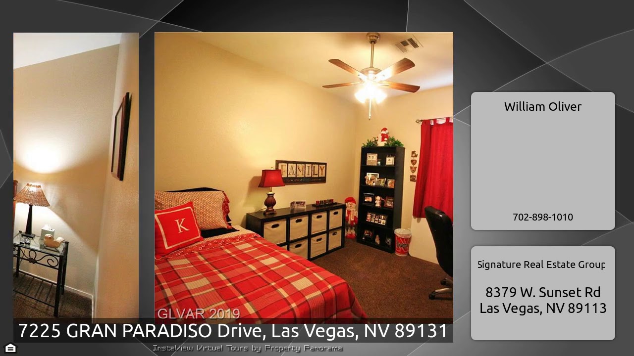 The Virtual Tour for the property at 7225 GRAN PARADISO Drive, Las Vegas, NV 89131 listed for $331,000: Other homes for sale by William Oliver of Signature Real Estate Group: Pulte single story home in Silverstone Ranch. Turn key home, move in ready. 10' ceilings. New carpet & tile floors, 2 tone paint, ceiling fans in all rooms. Blinds & window coverings on all windows. Master separate from others w/dual sinks, sep tub & shower and walk in closet. Kitchen with oak cabinets, tile floors, white appliances. Dining nook off the kitchen. Backyard features pool and spa, synthetic grass with sitting …