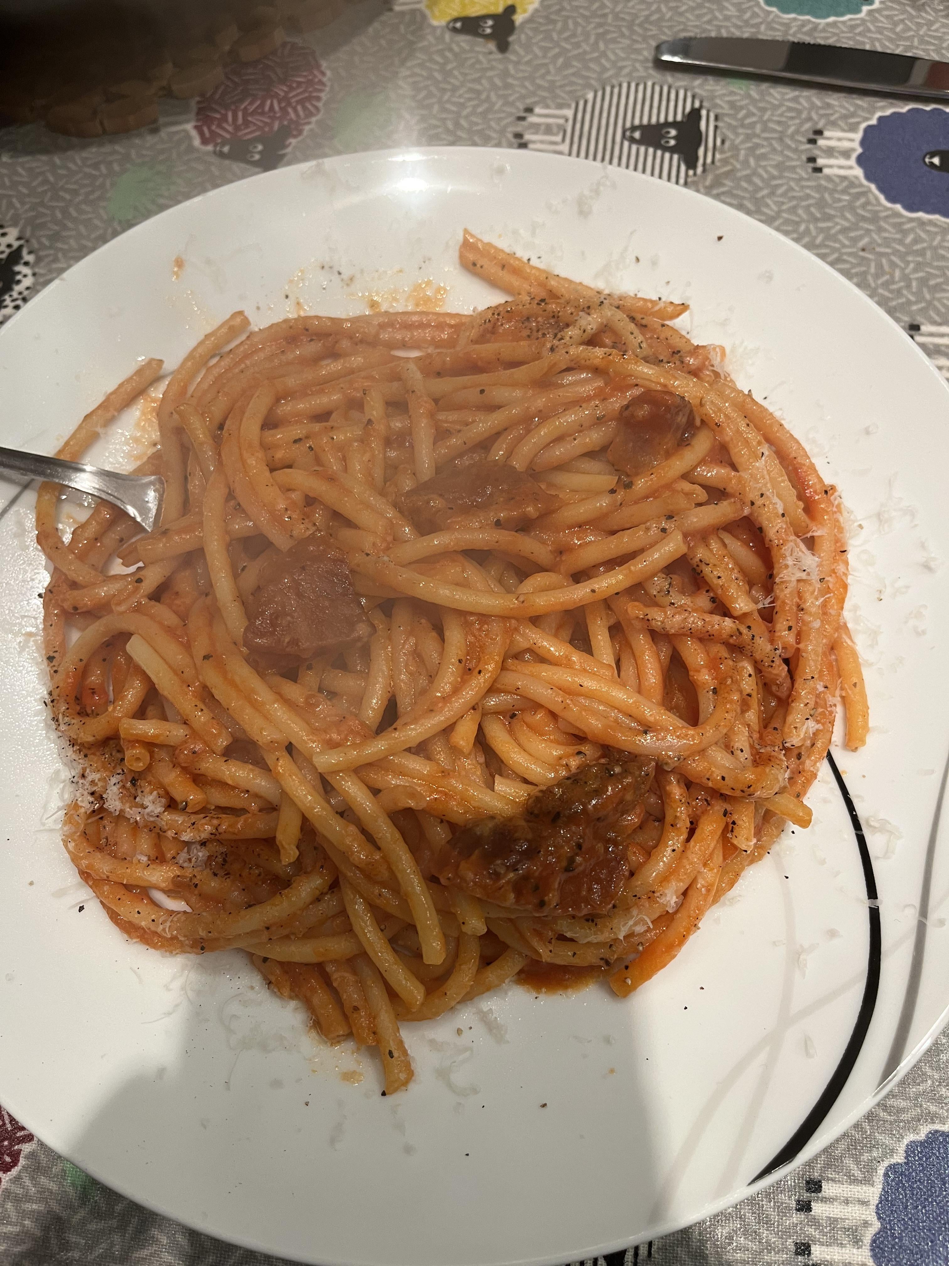 Bucatini, guanciale, pecorino romano, san marzano tomatoes. Black pepperby Kitchen-Match2297 Homemade DishPastaWrite A CommentYou must be logged in to post a comment.