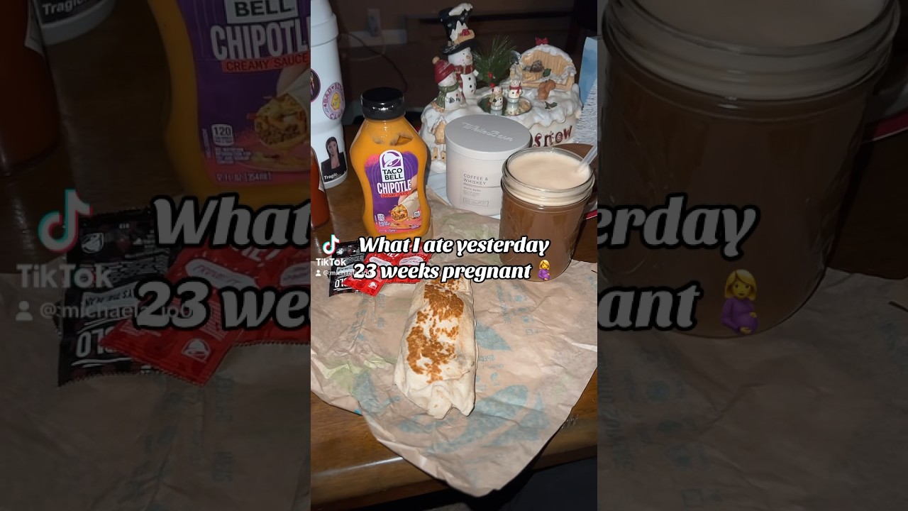What I ate yesterday 23 weeks pregnant oat milk coffee Taco Bell cheesy potato breakfast burrito with di blow sauce and chipotle Yummy lunchtime Little Caesars one bread sticks with cheese and marinara one slice of pepperoni pizza with cheese sauce lots of water dinner one slice of pepperoni pizza with wrench Cherry Pepsi one bread stick with marinara dessert noodle Nest a shot of prune Juice more water vitamins good night