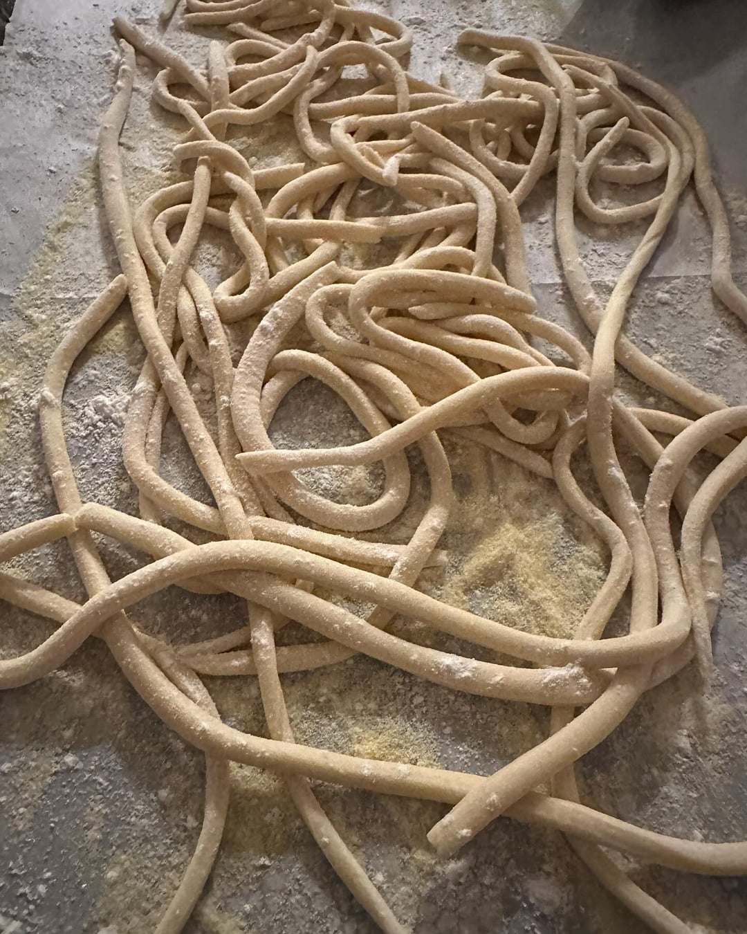 This shape is a 1:1:1 semolina, AP, warm water. Just a touch of salt. 1/8” wide and thick, rolled my hand into rounded strands, like bigoli. Great chew, nice and supple – at the behest of my partner, we had it with garlic, shrimp, calabrian chile, white wine, butter, and lemon zest which was amazing, but the pomodoro suggested in the book would be way better for the entire experience. Curled up a bit real cute-like in the pasta pot. Highly recommend this easy ass shape. And it’s vegan, for those who celebrate.