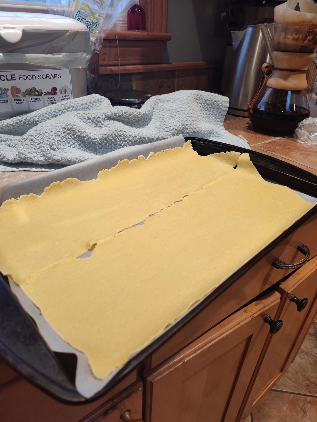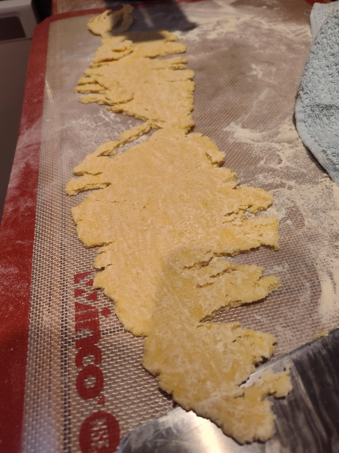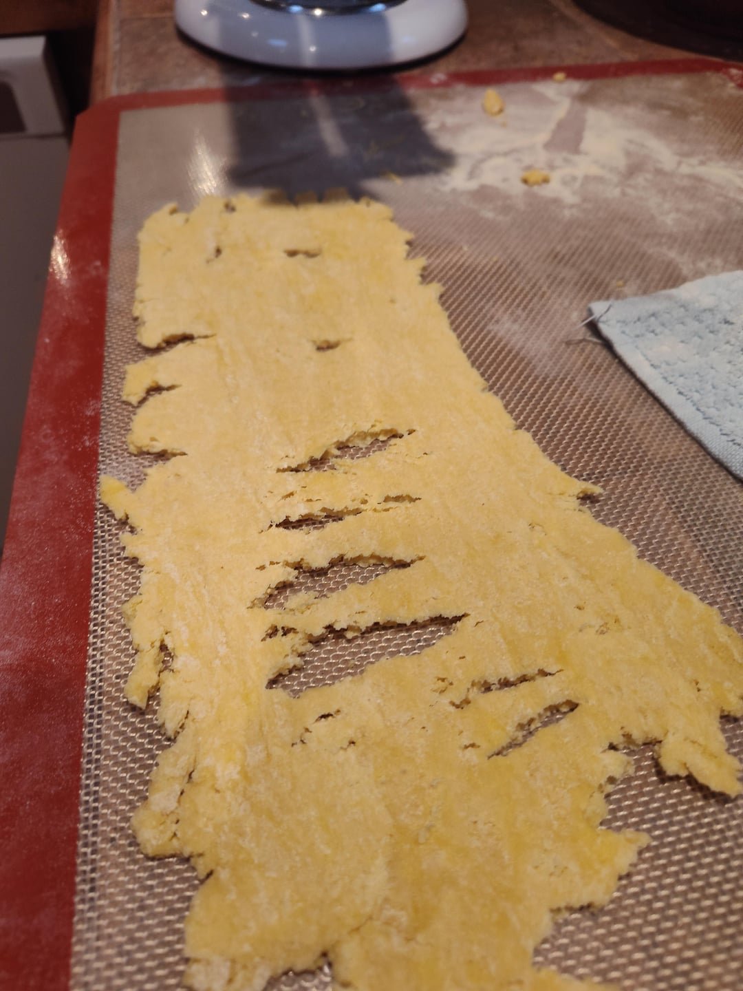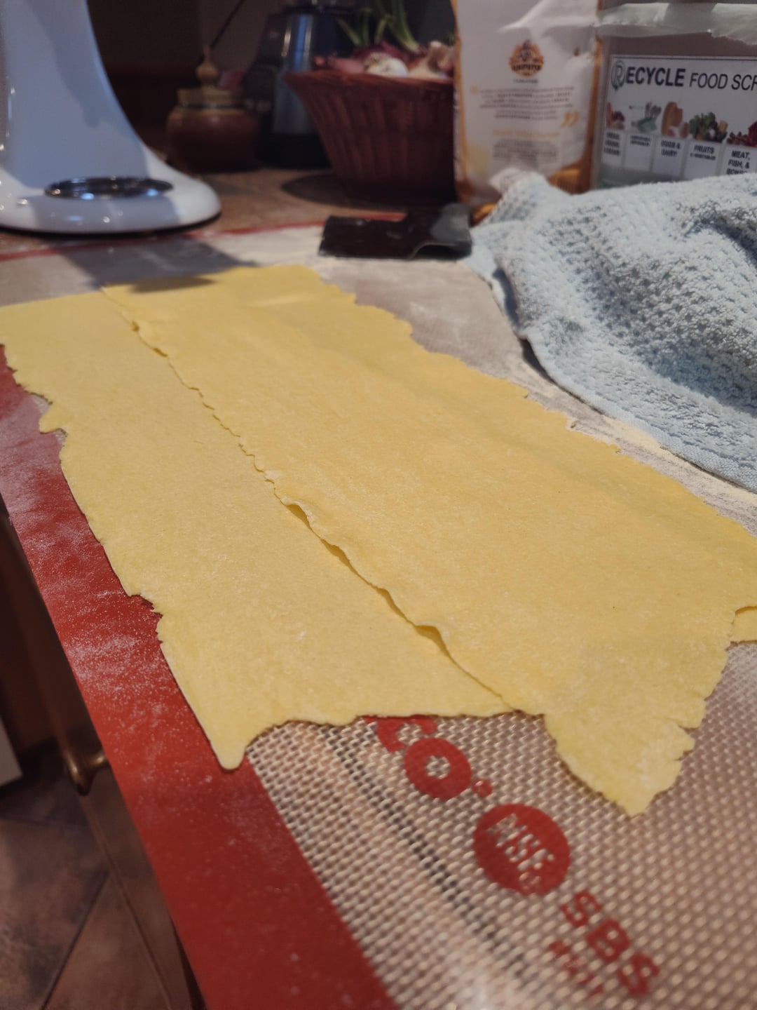 Quartered, then Pressed flat and rolled, fold over on itself, roll it, fold over on itself, roll it — do this 4-5 times and you’re ready to pass through and start rolling to desired thickness. On the kitchen aid, I usually pass through until 6-7 for lasagna and 8 for rav and other stuffed pastas.
