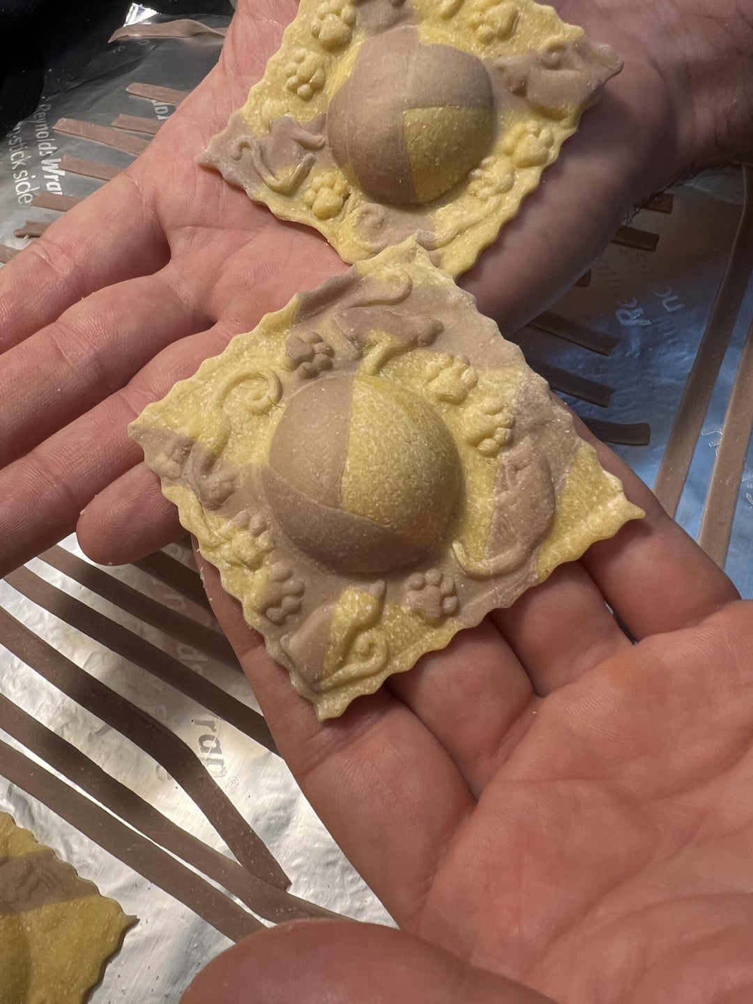 Egg dough laminated with a red wine dough for fun, filled with chicken and Boursin cheese.