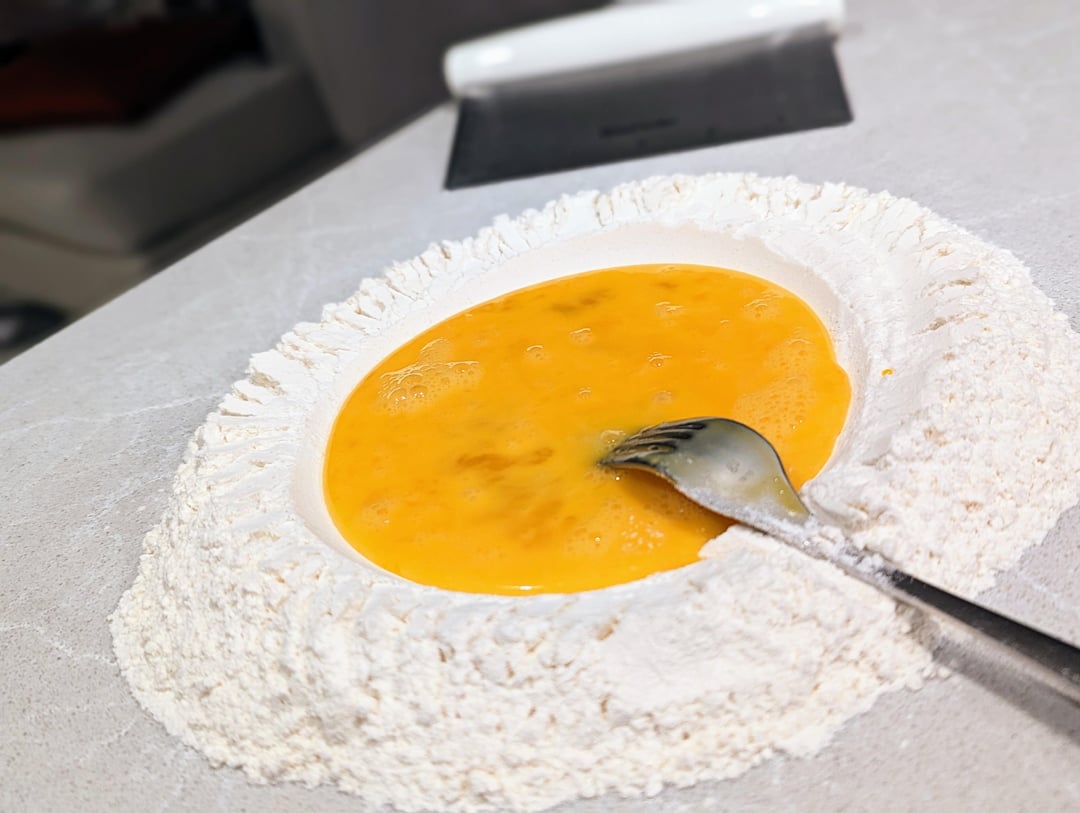 200g 00 flour, two large eggs + one yolk. The extra yolk really makes it that much richer. No olive oil or salt needed, and in fact it makes the dough less malleable in my experience. Combine and knead the dough until when you push on the dough, it springs back to original position, typically about 8-10 minutes. Let rest for 30 minutes – don’t skip this step.