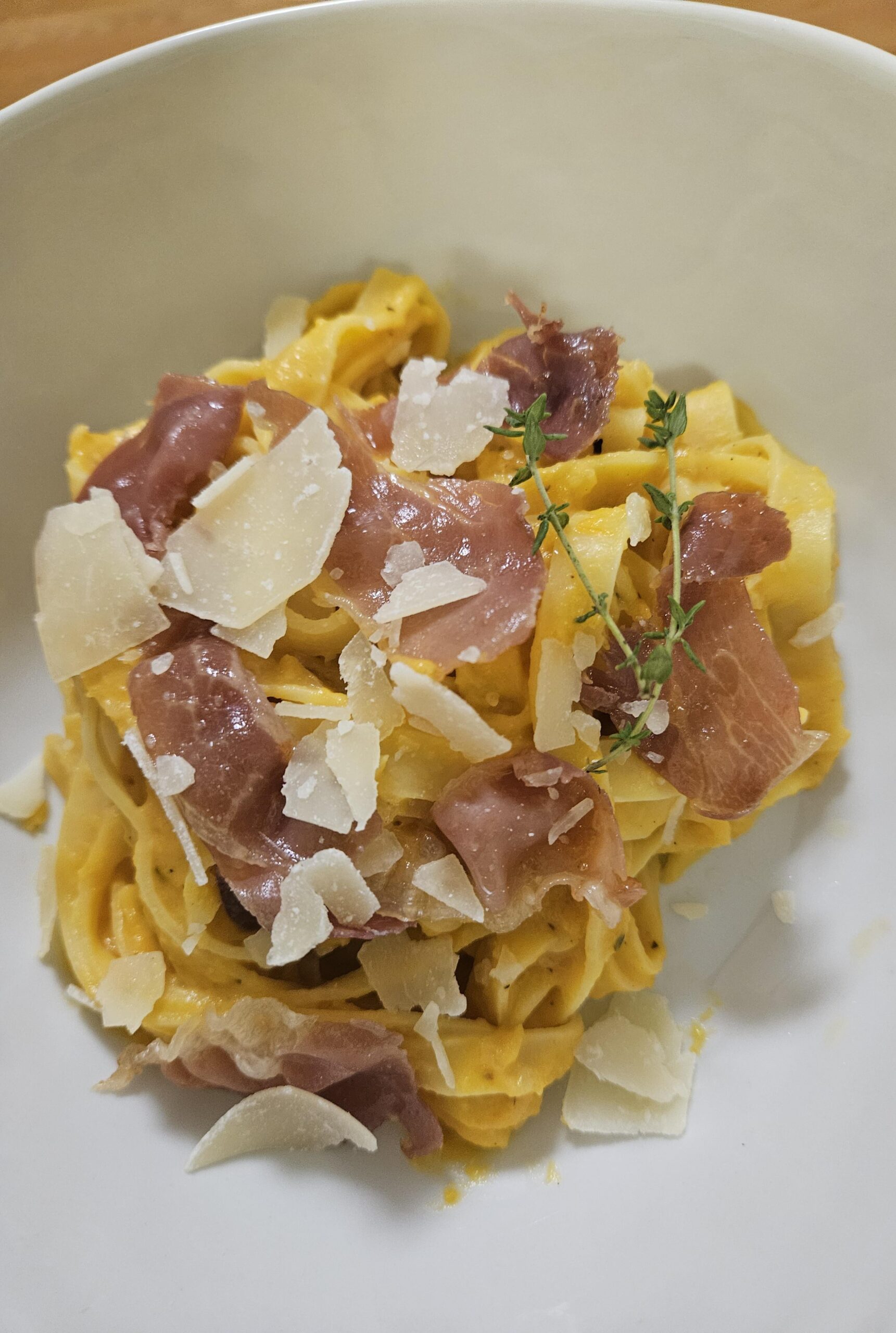 Needed to clean out my pantry before my weekend grocery run. A butternut squash has been sitting on my counter for weeks, the last remnant of my autumnal recipe craze. I didn’t want it to go to waste but didn’t have another soup or roasted root vegetable dish left in me. I had some thyme nearing the end of its shelf life and some fresh fettuccine I had frozen on a whim and those served as the inspiration. Overall, I was pretty pleased with result.