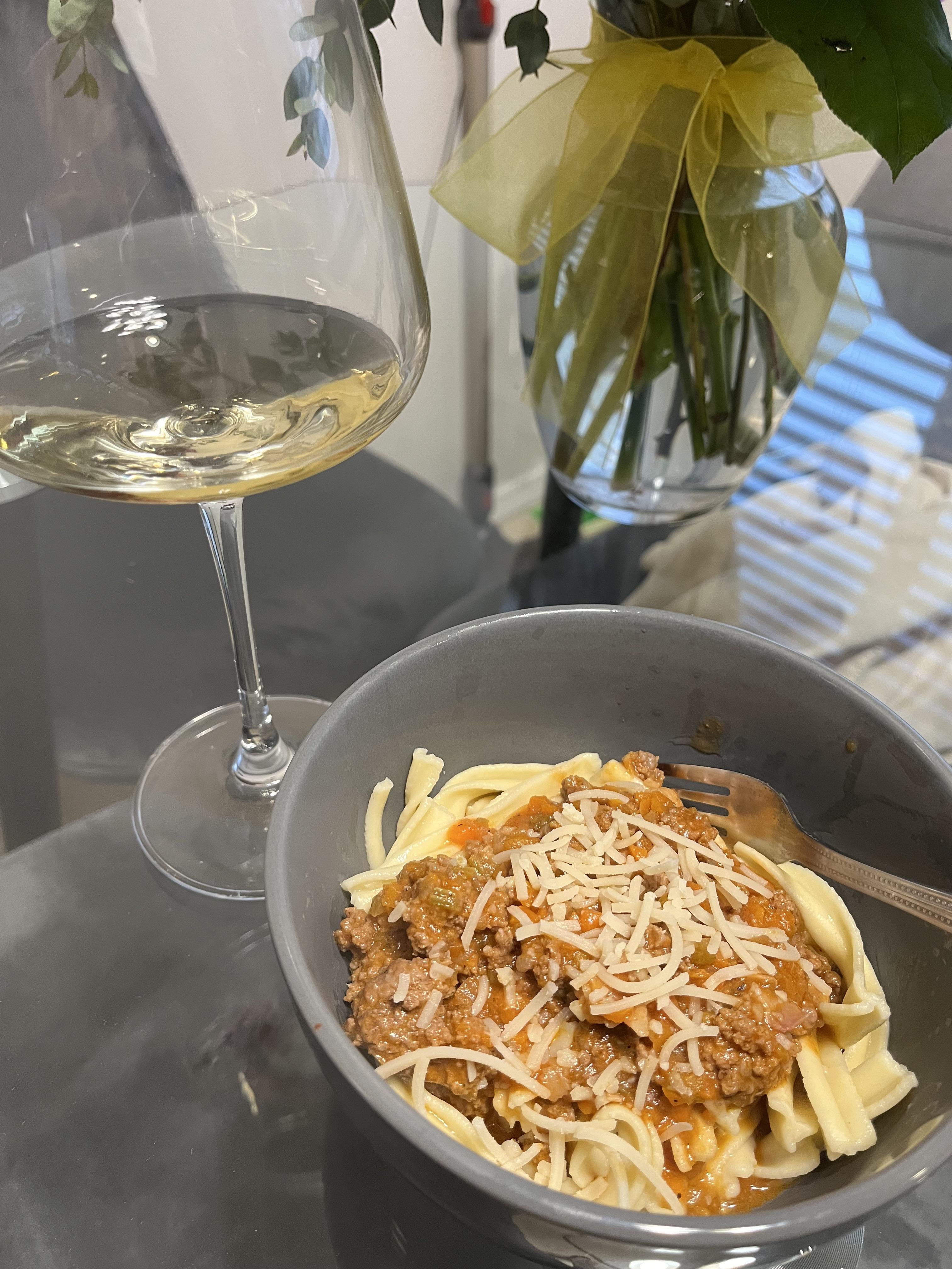 Bolognese: carrot, celery, shallot, onion – dice finely or use food processor. Pancetta and half pound of beef and pork, with white wine, Parmesan and beef stock 🙂