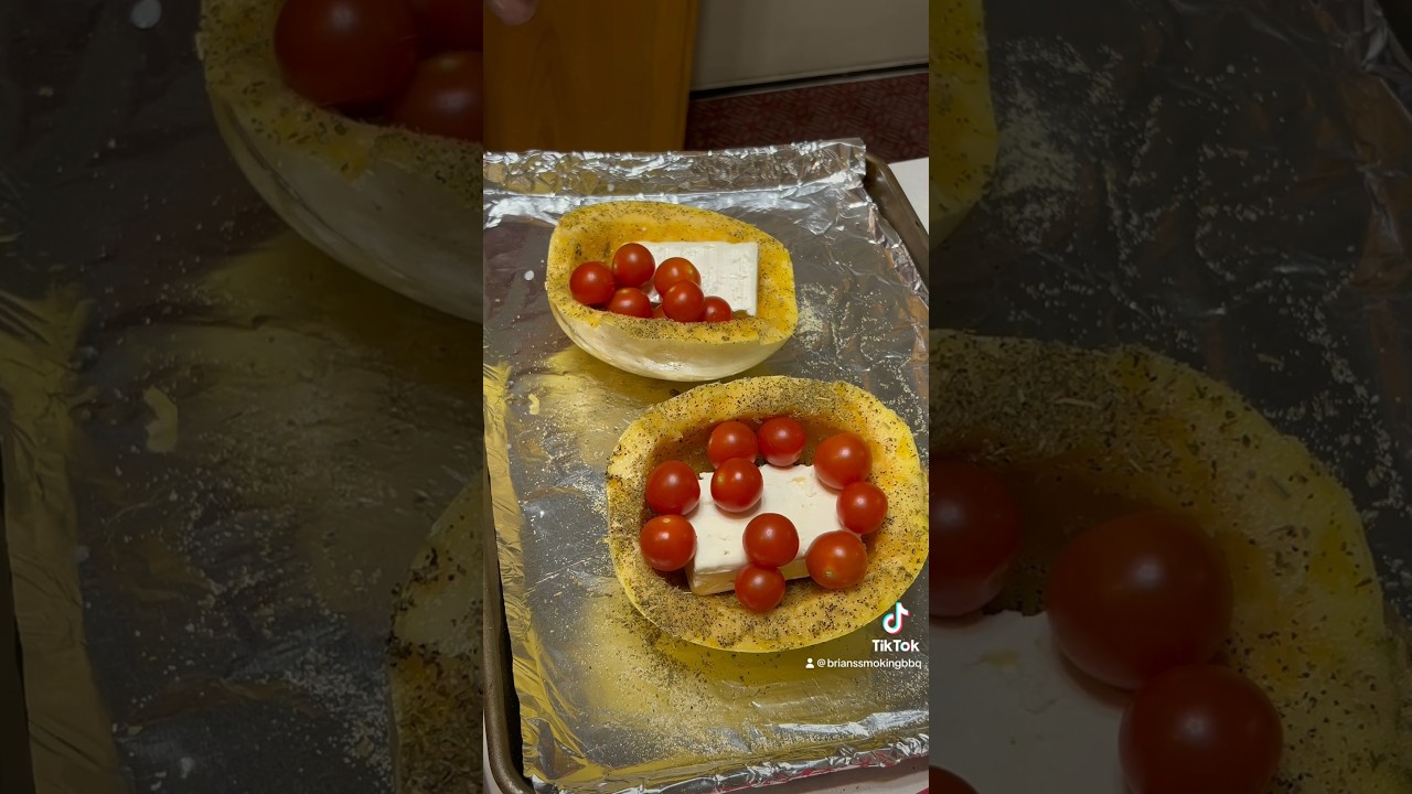 Good go ahead and flip them over and then poke some holes in them they will crack if they’re a little hard it is what it is then I took a block of feta split it in half put it in each side and then we went in with our cherry tomatoes