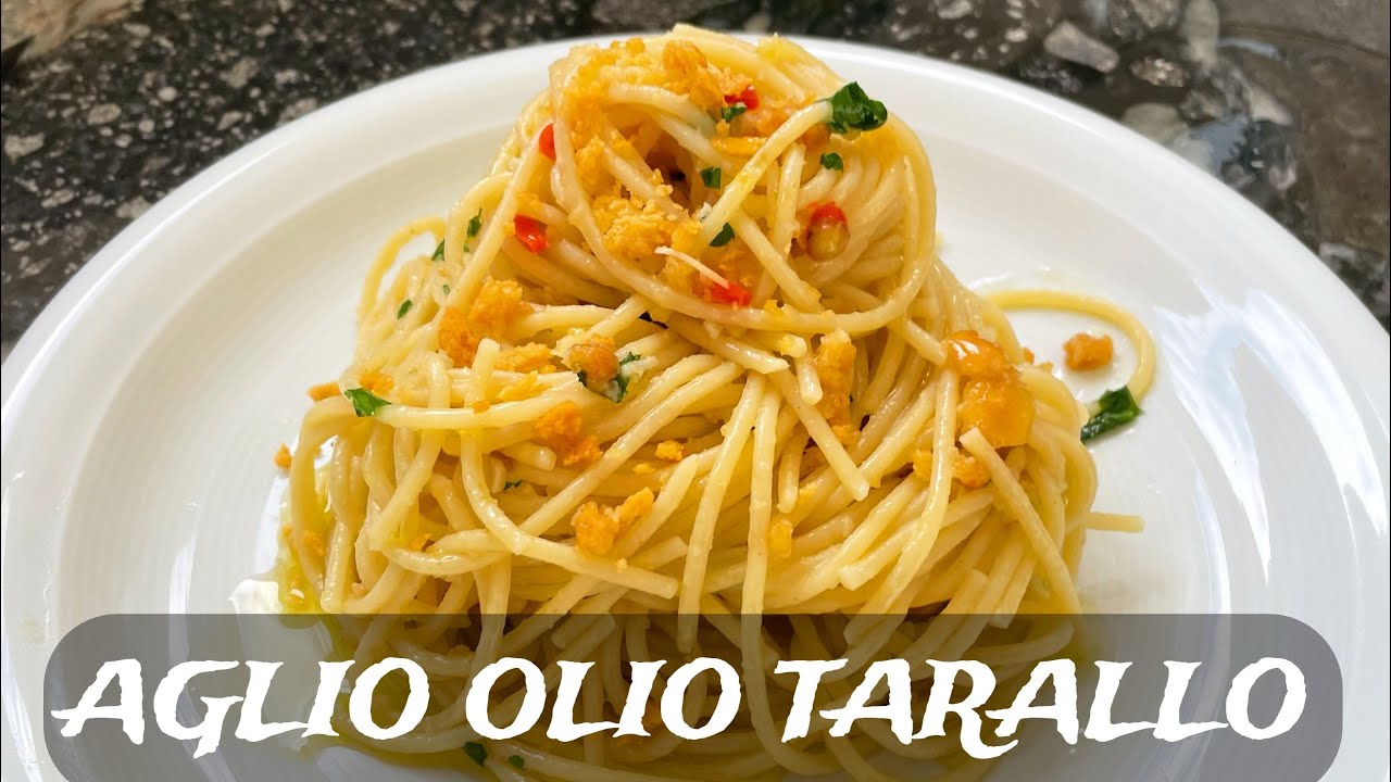 how to cook spaghetti aglio e olio like an Italian. Spagheti with garlic and extra virgin olive oil is a very classic dish from the South of Italy, and a typical midnight meal. This variations includes a topping of taralli (savory crushed snack, and certainly some hot peperoncino (chili). it is incredibly quick to prepare. But that does not mean it is easy: First of all you will need the right quality ingredinets (the extra virgin olive oil and spaghetti trafilati al bronzo). And you will need the right technique to turn the spaghetti into a creamy result, while remaining al dente.