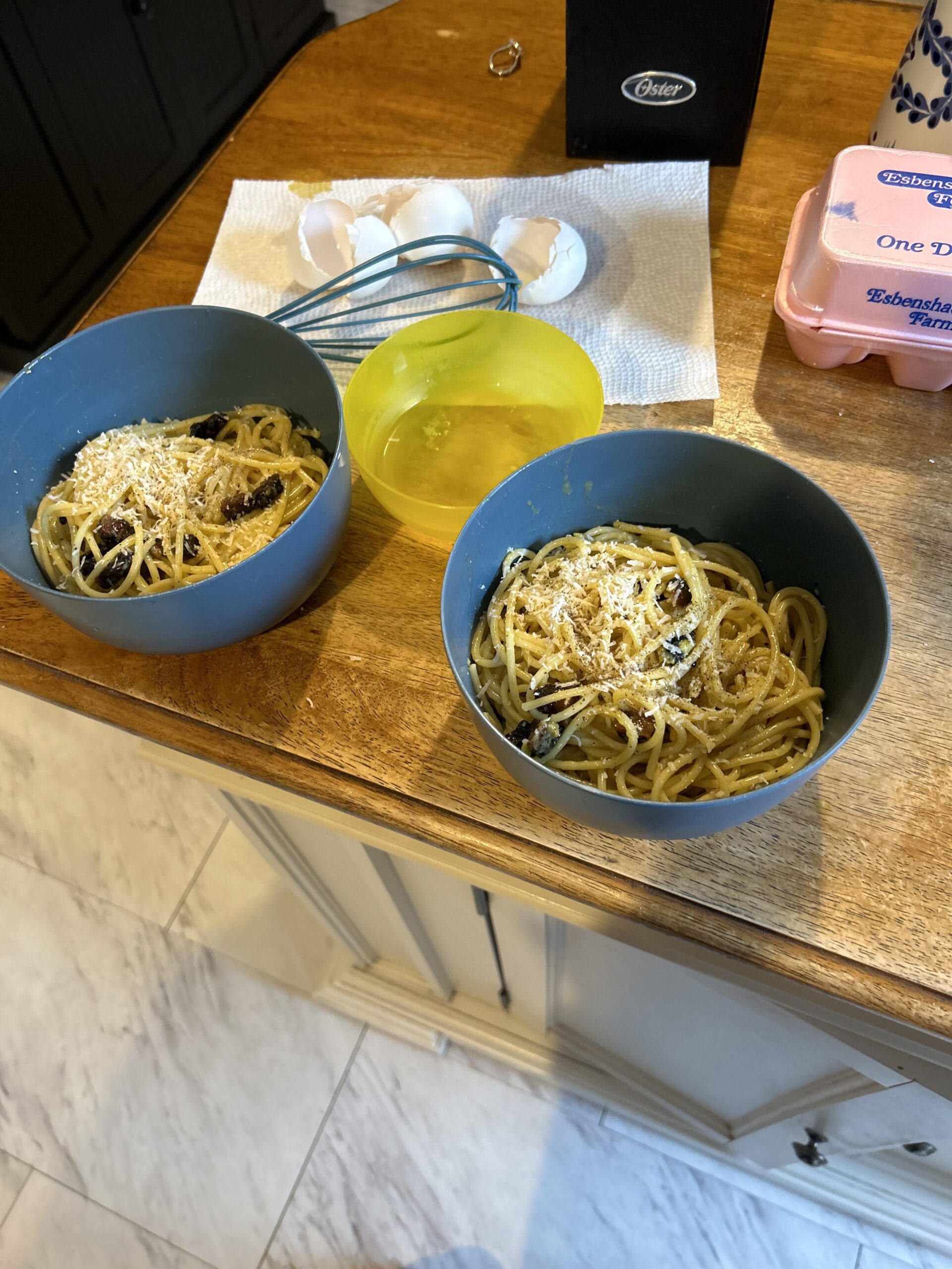 Spaghetti (I used bucatini yesterday and didn’t have enough for today so I used thin spaghetti.) Guanciale, pecorino cheese, three egg yolks and some pepper.