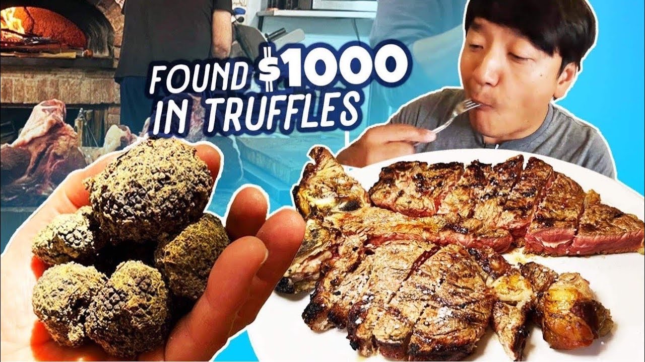 Here this dish covered in truffle like covered in black truffles six euros this in the u.s easily probably 20 bucks 30 bucks amazing deal the owner comes to you personally and show you the steak That looks good one and a half kilo steak that looked beautiful 1.56 kilos of just gorgeous smelling plate of t-bone meat they don’t ask you how you want your steak it is all cooked the same way usually five minutes on each side They don’t put a lot of seasoning on this you only get a little bit of salt on this just so you can taste that great flavor of the steak yourself and the steak is not very fatty so it doesn’t do the typical melting thing as much But on the filet part of the t-bone it’s just so so tender i just like butter you definitely get more of an intense beefy flavor from this cut it just tastes so clean and also that gray smoke from the oak wood fire and that’s how every one of these steaks is