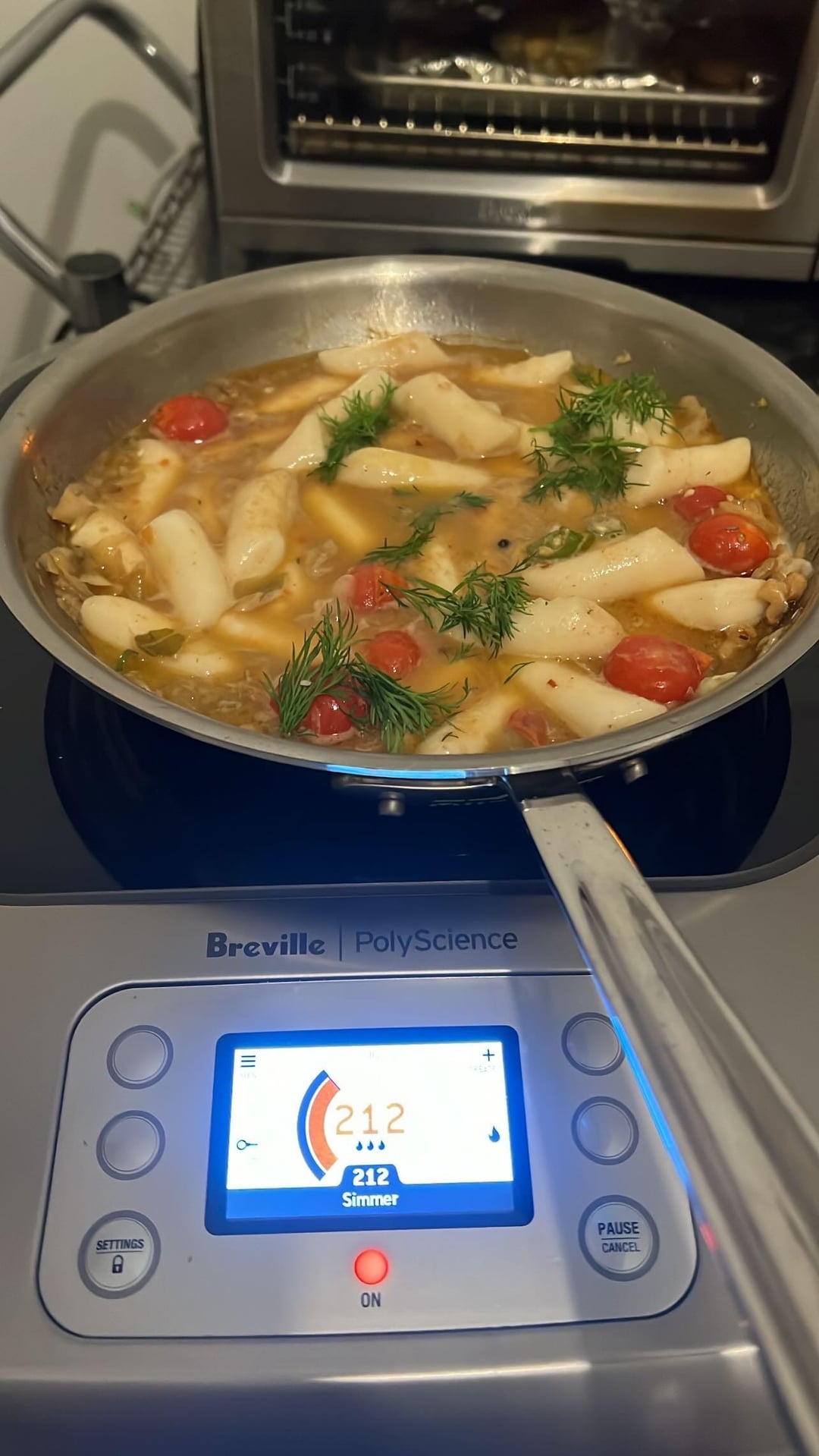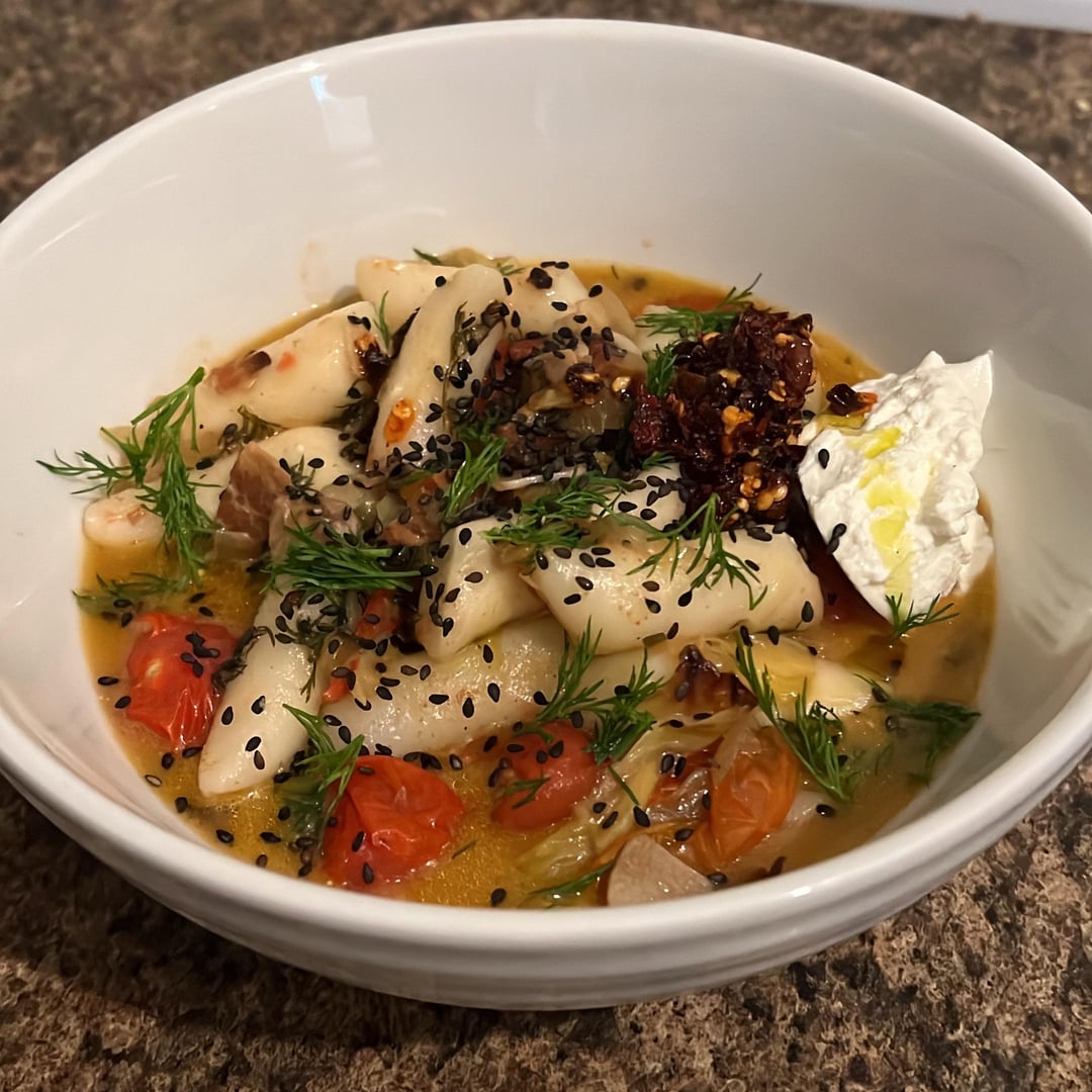 Rice cakes cooked in chicken stock with dill, garlic, cherry bomb tomatoes, dill, sour cream, roasted black sesame seeds, evoo, and Lao Gan Ma Spicy Chili Crisp
