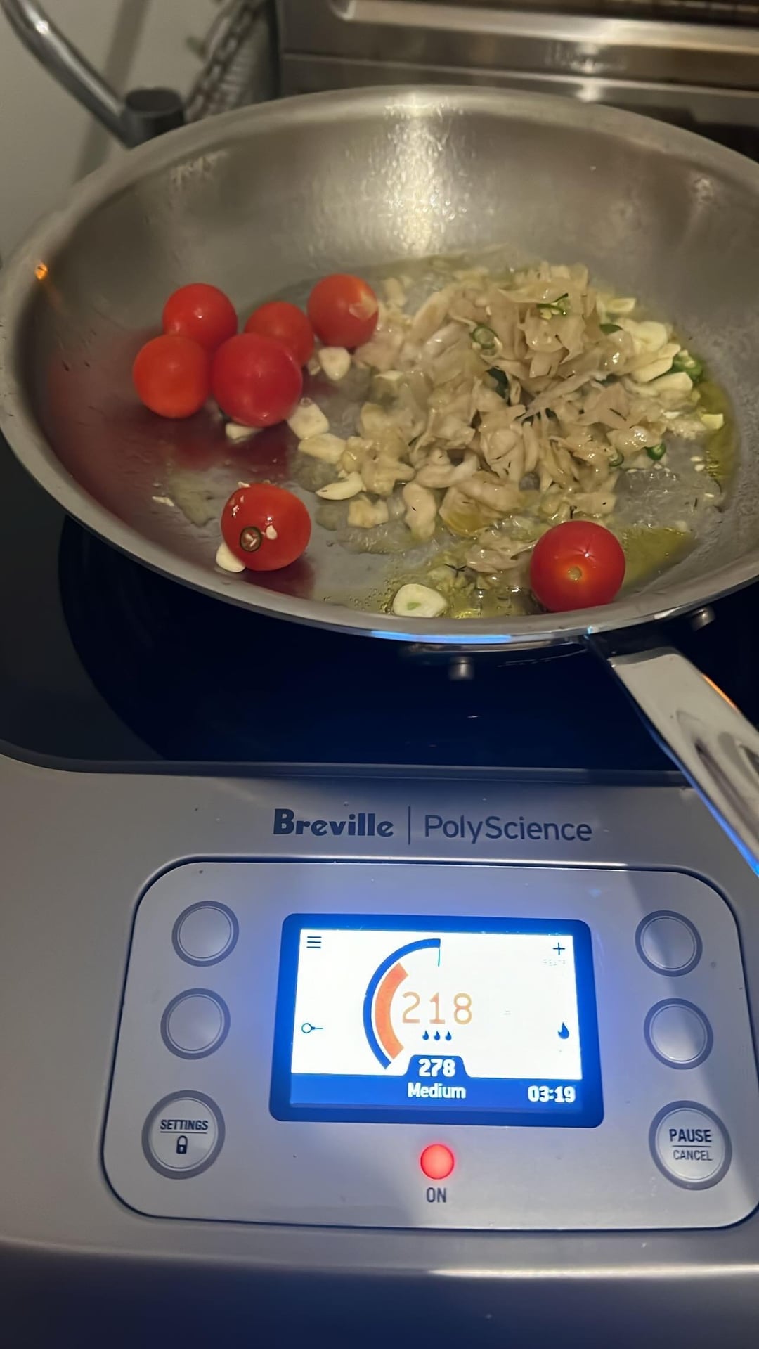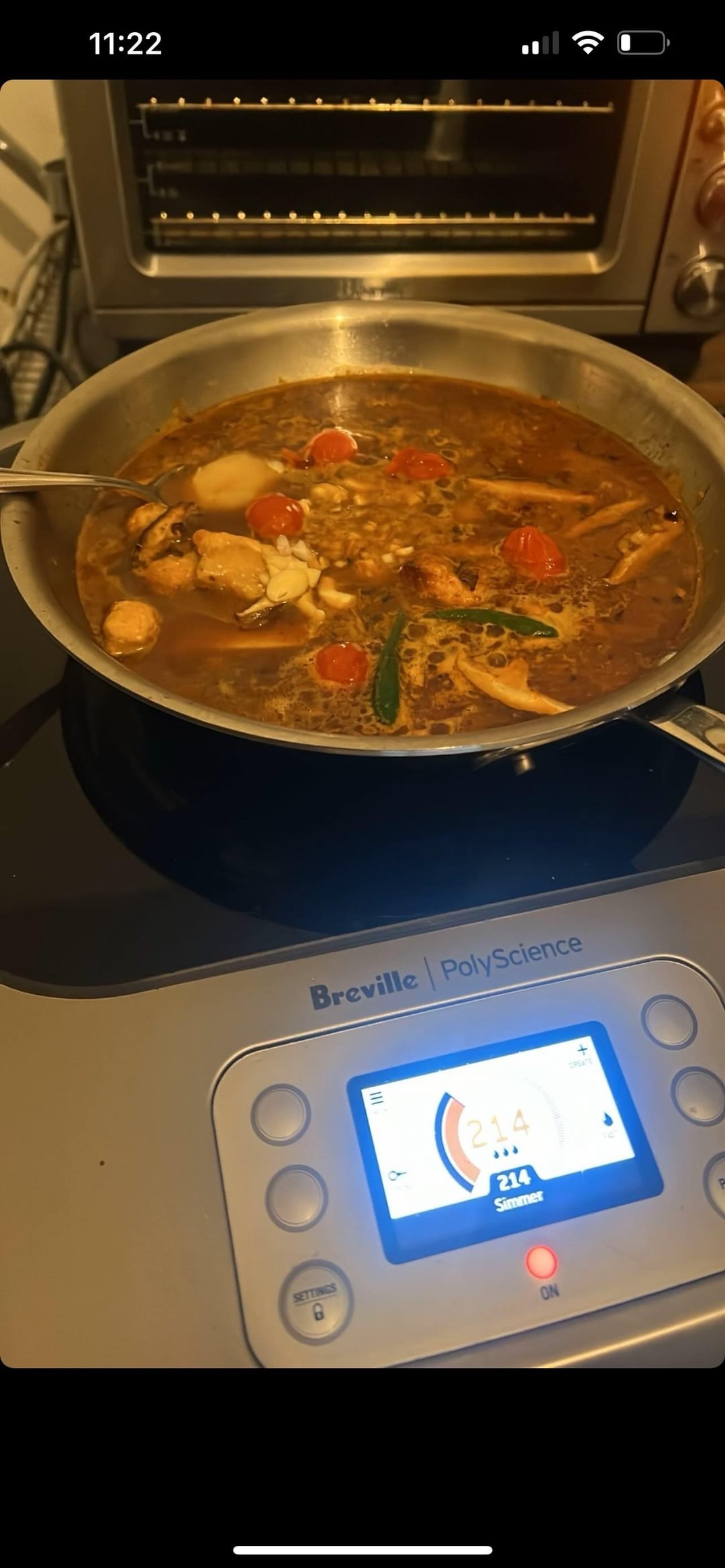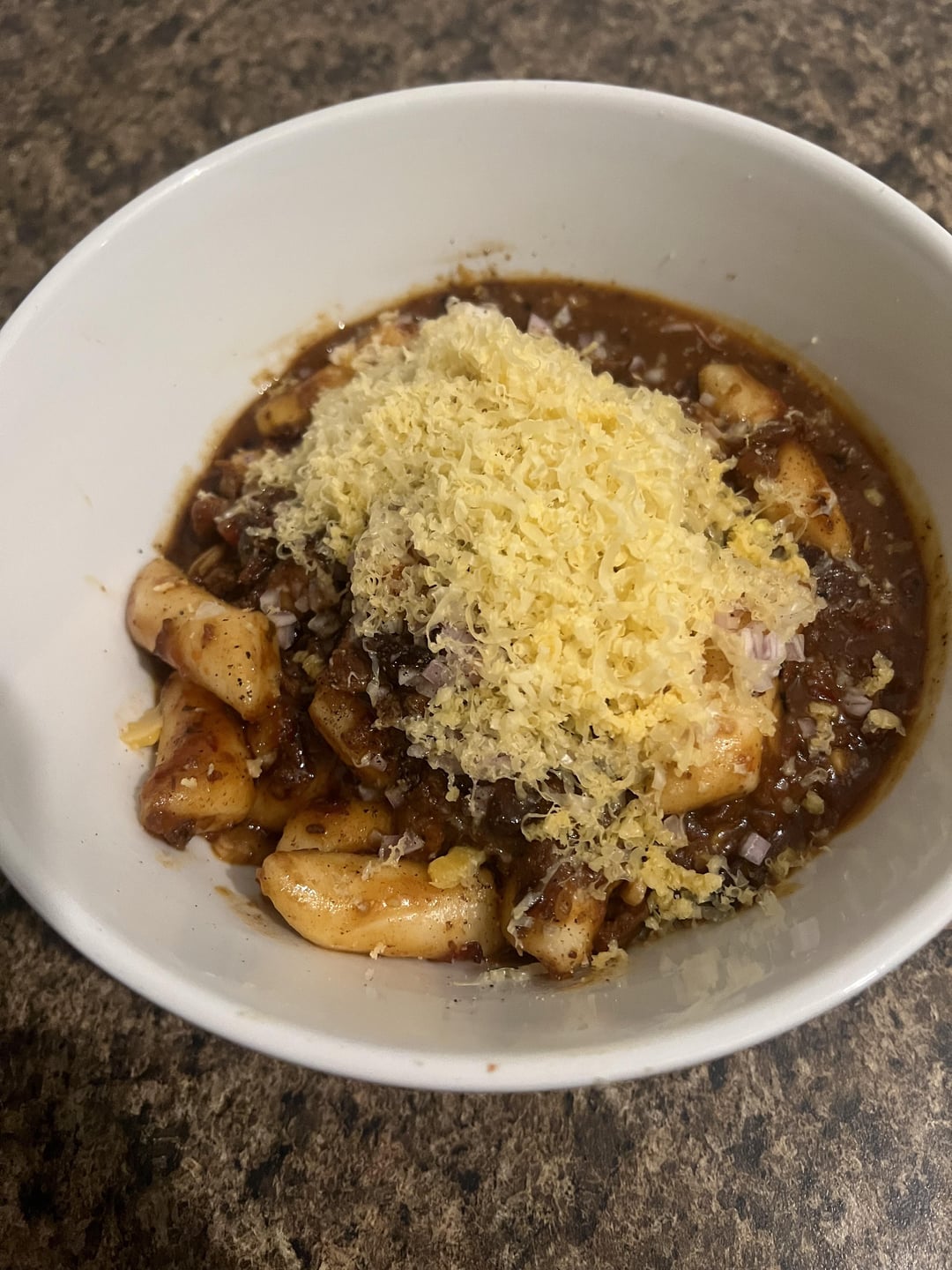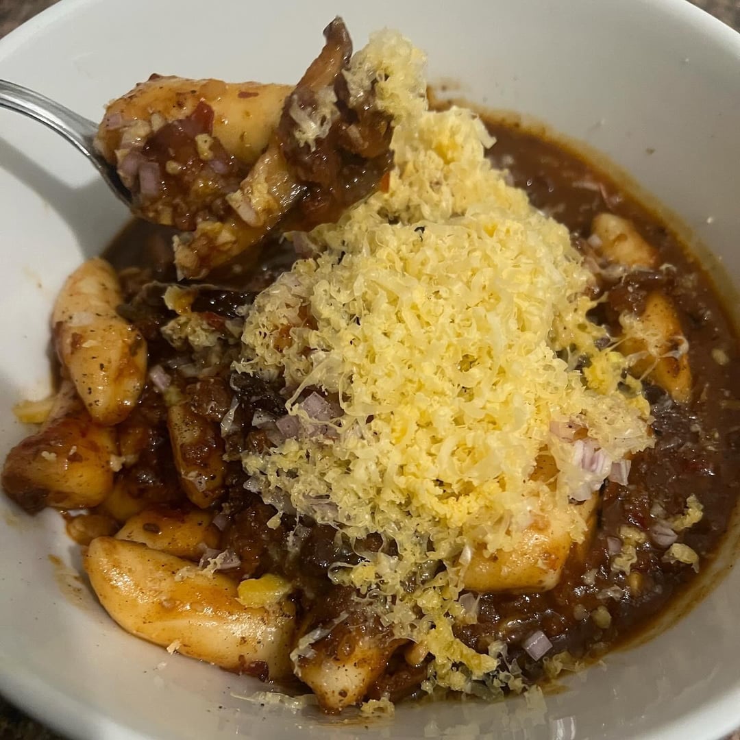 Rice cakes cooked in parmigiana reggiano rind lehua blossom honey flavortown chicken bone broth chili garlic sambal oelek Thai peppers meat sauce with shiitakes, cherry bomb tomatoes, garlic, gran deposito balsamic, evoo, diced shallot, tillamook sharp cheddar, Jacobson salt, and pepper