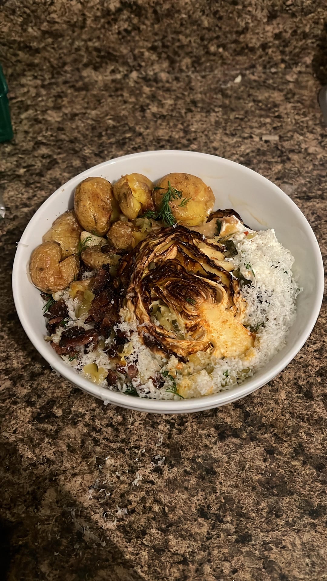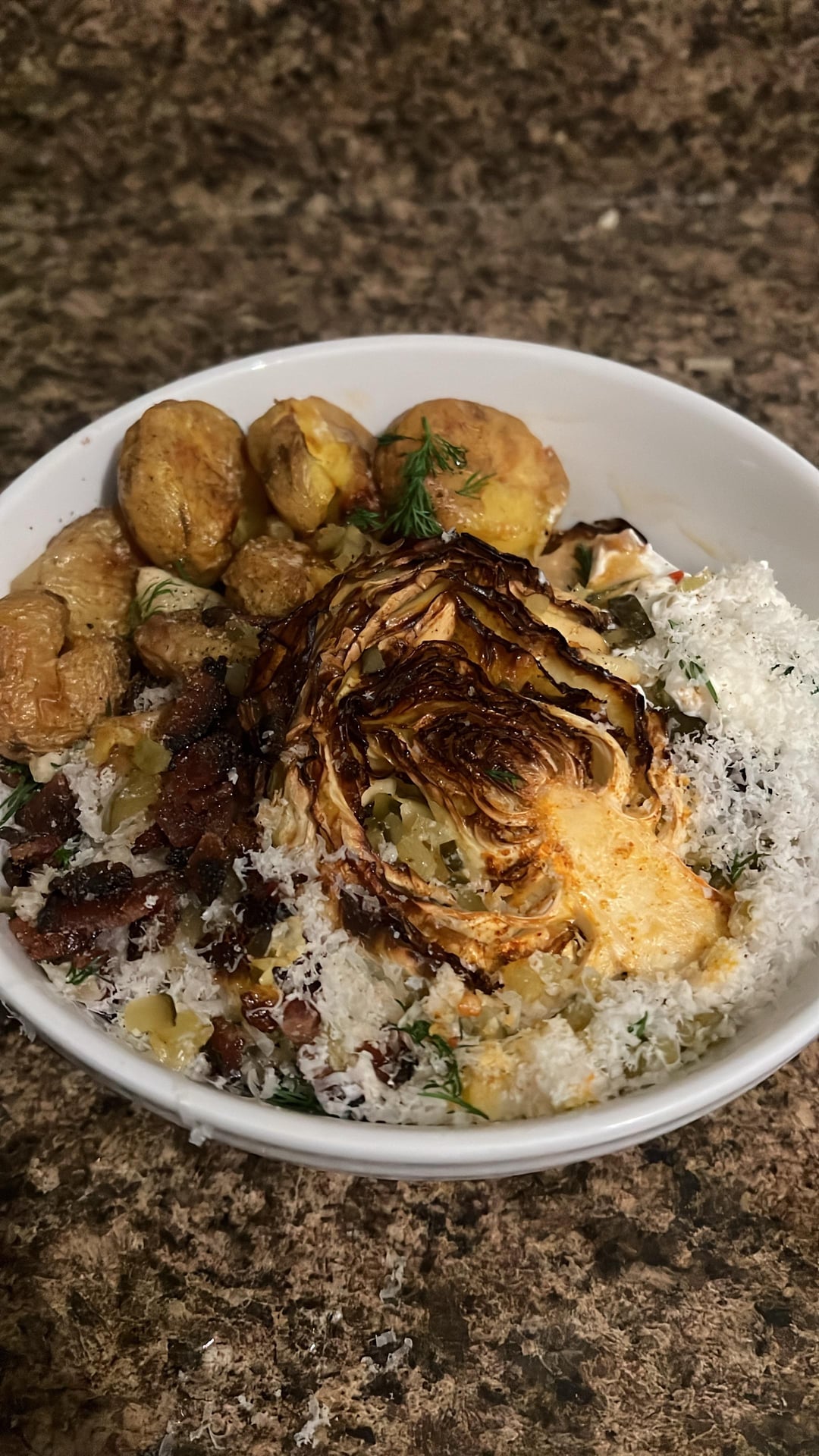 Boiled with parmigiana reggiano rinds and a bay leaf/smashed potatoes baked with cabbage stuffed with garlic and parmigiana reggiano rinds with par-cooked rice cakes finished in sautéed whiskey dill sauerkraut, cherry bomb tomatoes, and garlic seasoned with smoked paprika, coriander, thyme, chili flakes, sambal oelek, chicken stock, Trader Joe’s unexpected cheddar, crushed walnuts, evoo, and Jacobson salt and finished with dill, fermented peppercorns, diced bubbies spicy pickle, sour cream, grated parmigiana reggiano, isigny spring butter, sherry vinegar, maple sugar powder, maple peppered Black Forest bacon bits, and pepper