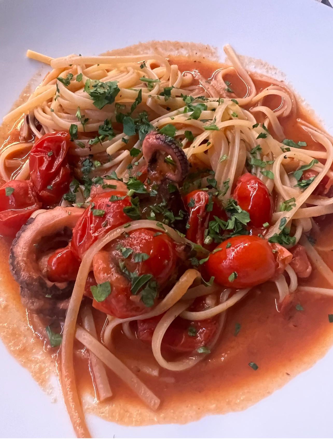 Ingredients 1 pound Dried pasta I bought in Sorrento 1 Kg curly octopus 250g small tomatoes 1 and 1/2 decilitre extra virgin olive oil 2 cloves garlic chopped parsley red hot pepper (optional) salt for taste by Brotosaurus1991 Homemade DishPastaWrite A CommentYou must be logged in to post a comment.