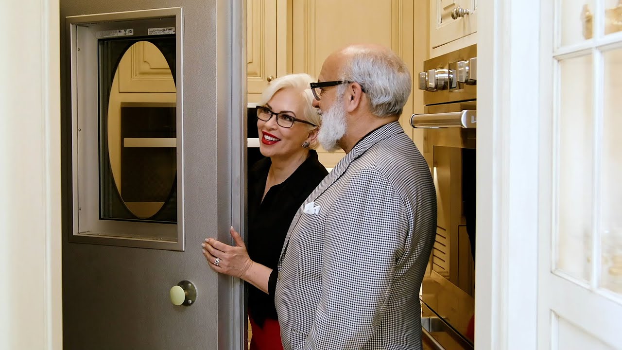 – [Kelli] Okay, through this mirror door. – Right through there. Another mirror door. A little secret, pop it open. – [Kelli] All right. This is incredible, what? – [Mark] Everybody needs a walk-in refrigerator, right?