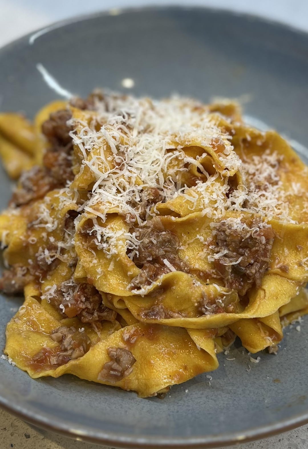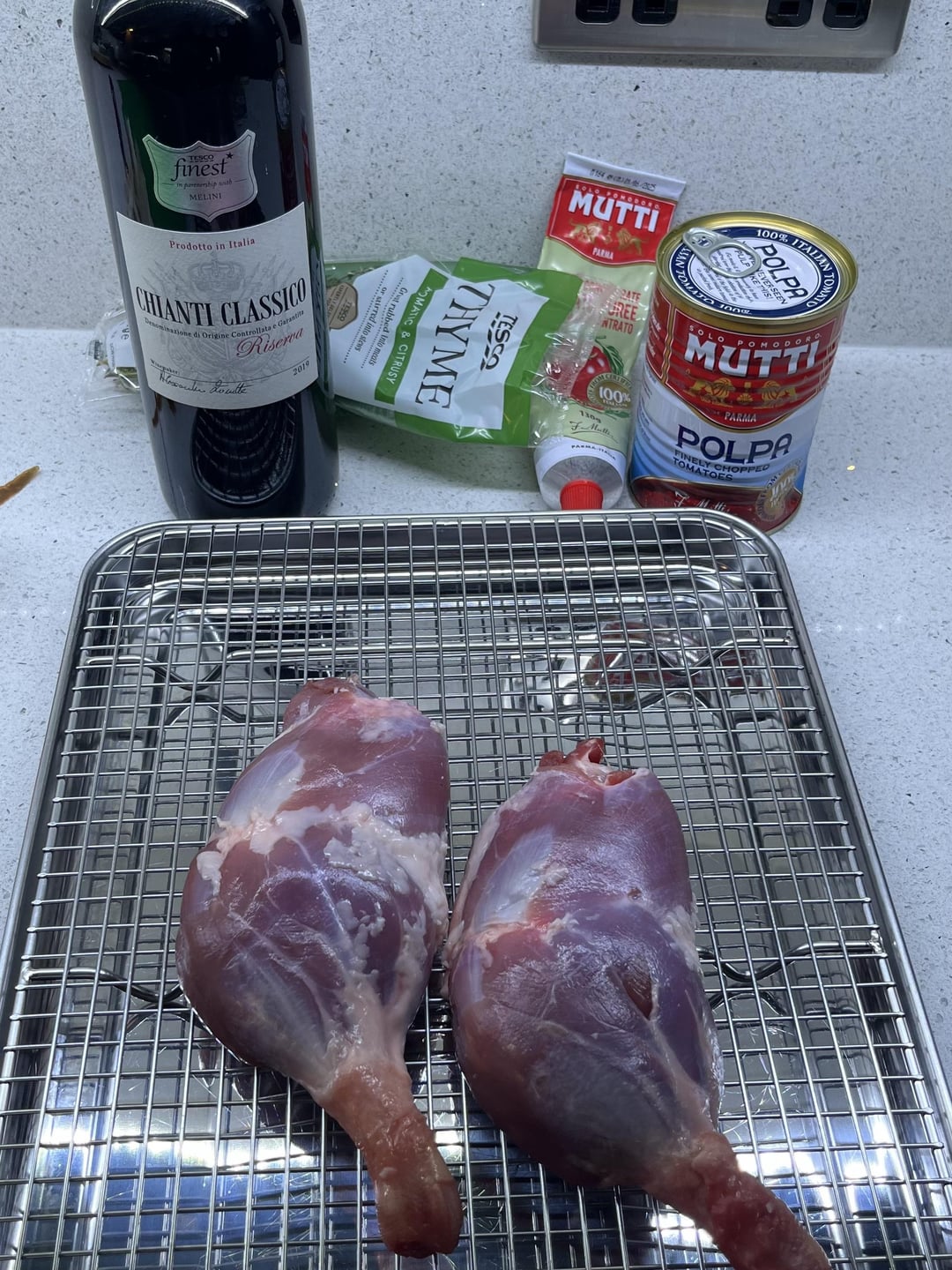 2x duck legs skinned. Skins rendered and soffritto cooked in fat. Pancetta, 1 garlic clove and tomato paste added. 1/2 glass of chianti riserva cooked off and tomato pulp added. In with the duck legs for 2 hours covered on a low simmer. Legs removed, meat shredded and added back in to sauce. Left overnight off heat and all finished off in pan next day.