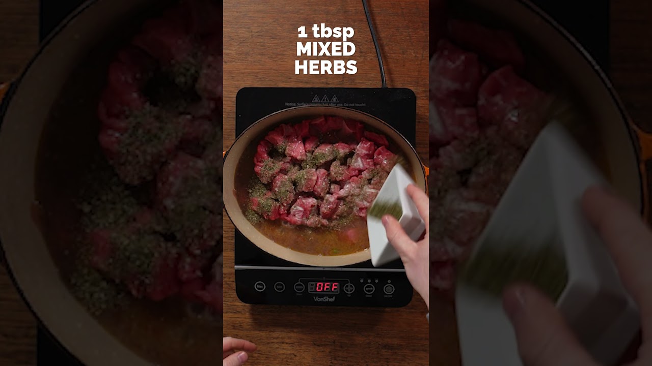 Add the cornflour, beef stock, beef, mixed herbs and salt. Mix through, cover and pop into the oven for around 3 hours.