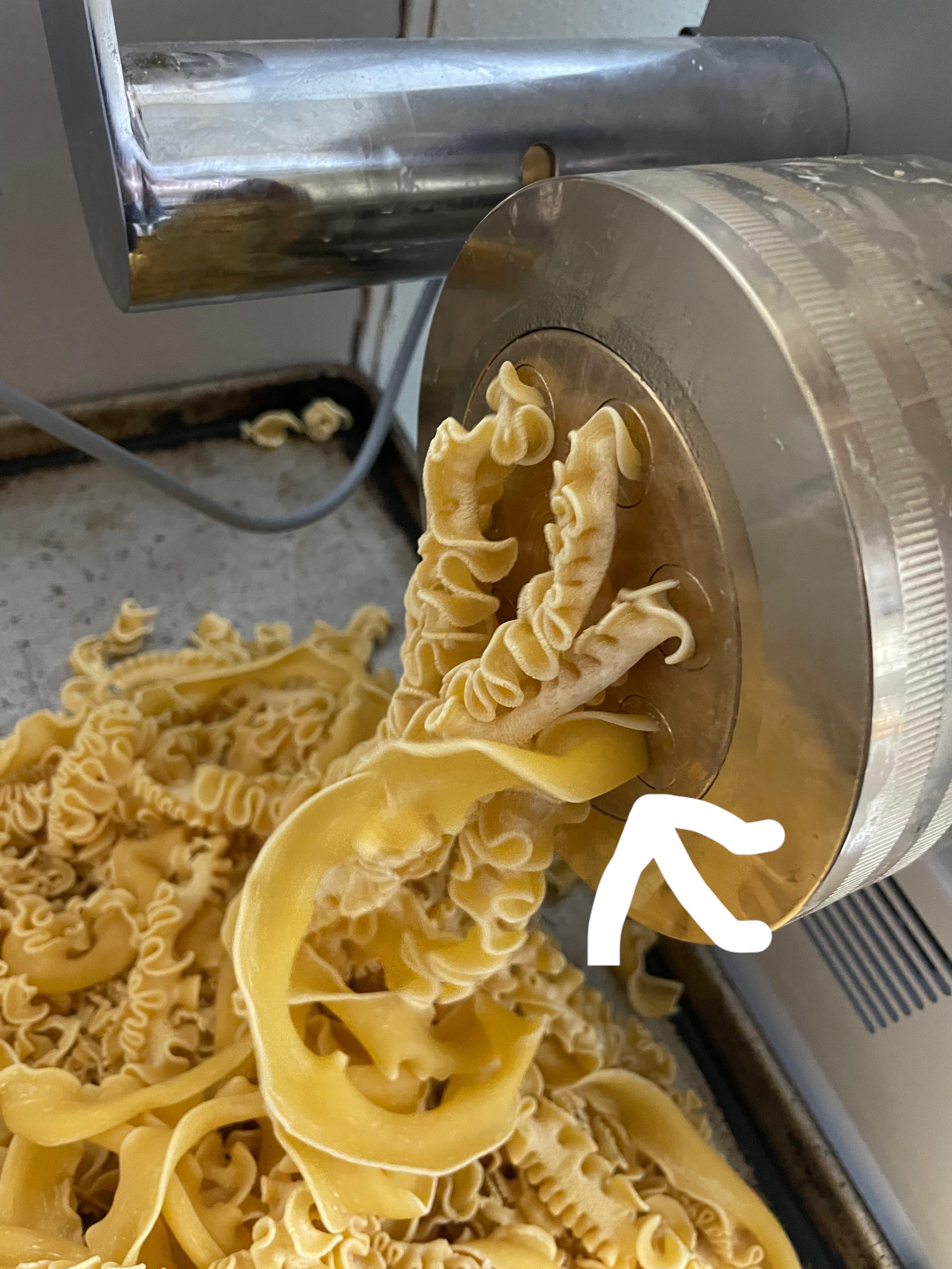 Can anyone help me understand what’s going on here? I’m using a TR 110. There’s seven extrusion points on the front of the draw plate. 6 come out more slowly and exactly what I’m looking for, the seventh shoots out and doesn’t curl. I’m using whole eggs and semolina flour, 1400 grams egg to 4000 grams flour