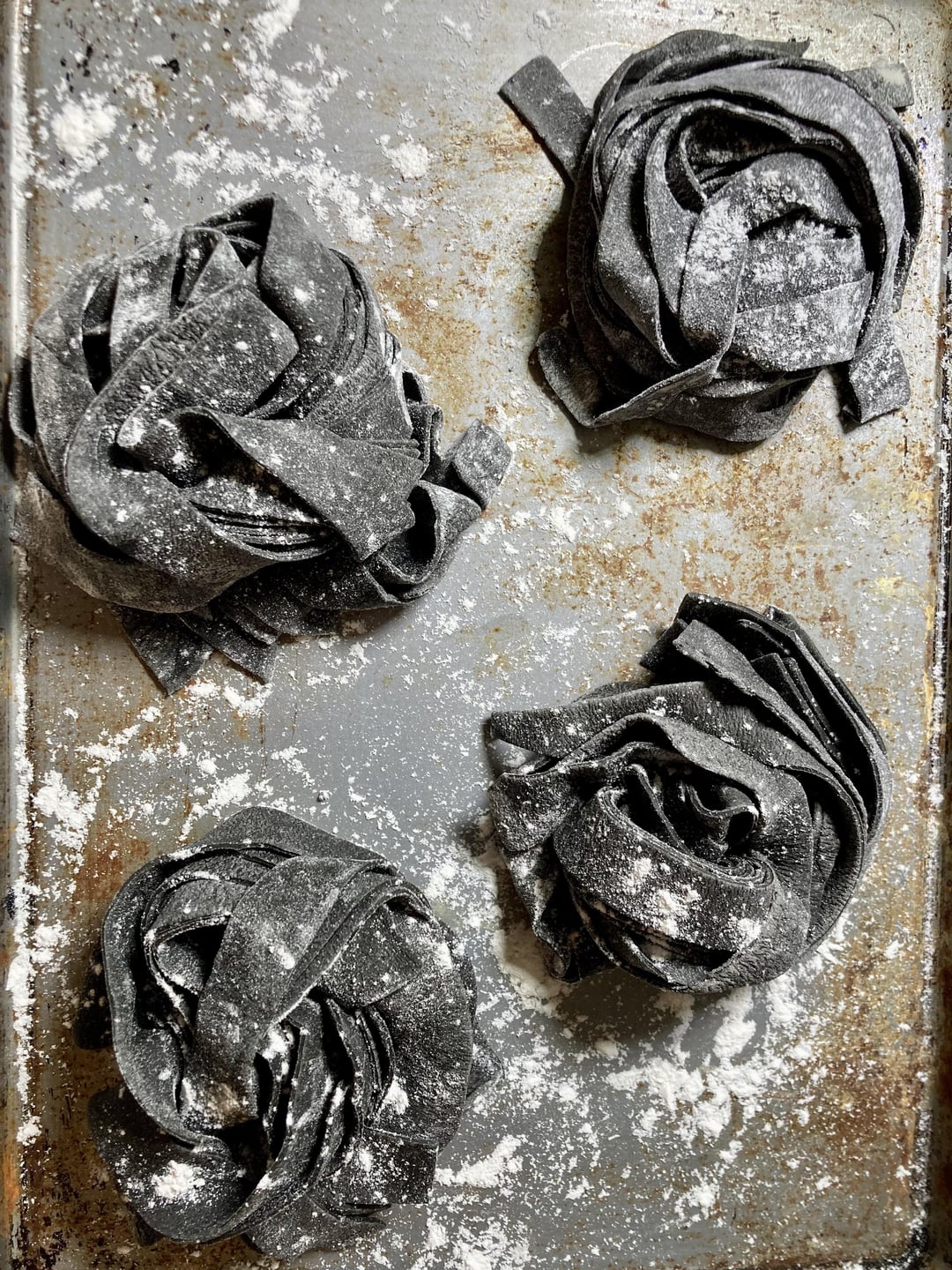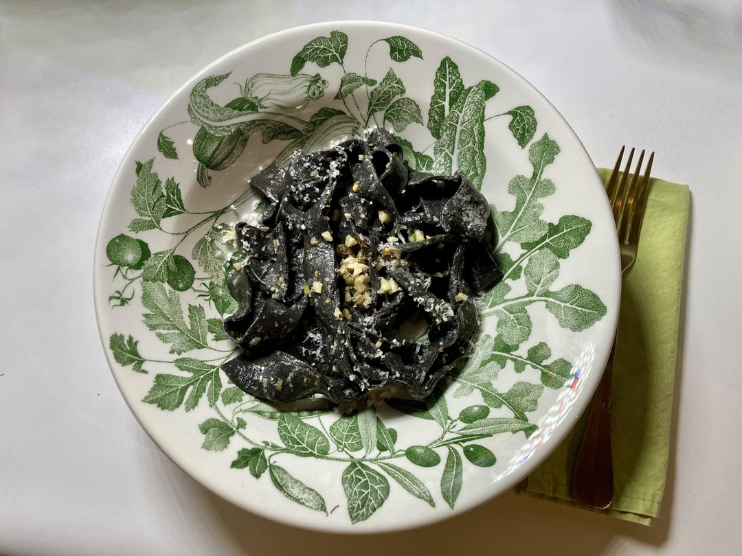 My first try at cuttlefish ink pasta from scratch. I used my normal flour & egg pasta recipes but blended 1 tbsp ink into the eggs before adding to the flour. The dough smelled briney in a really pleasant way. I incorporated half the batch into my favorite weeknight pasta recipe – Midnight Pasta from the NYT – and froze the other two nests.