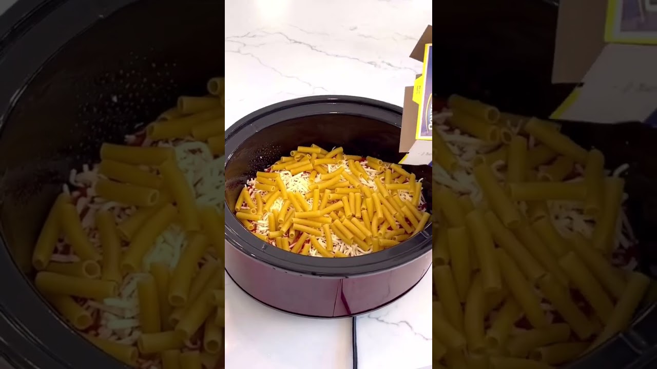Let’s make big ziti in the crock pot first spray your crock pot add in 1 24 oz jar of marinara sauce top with mozzarella cheese and half of a 16 o box of ziti in a separate bowl mixed together 15 oz of rata two eggs 1 cup of