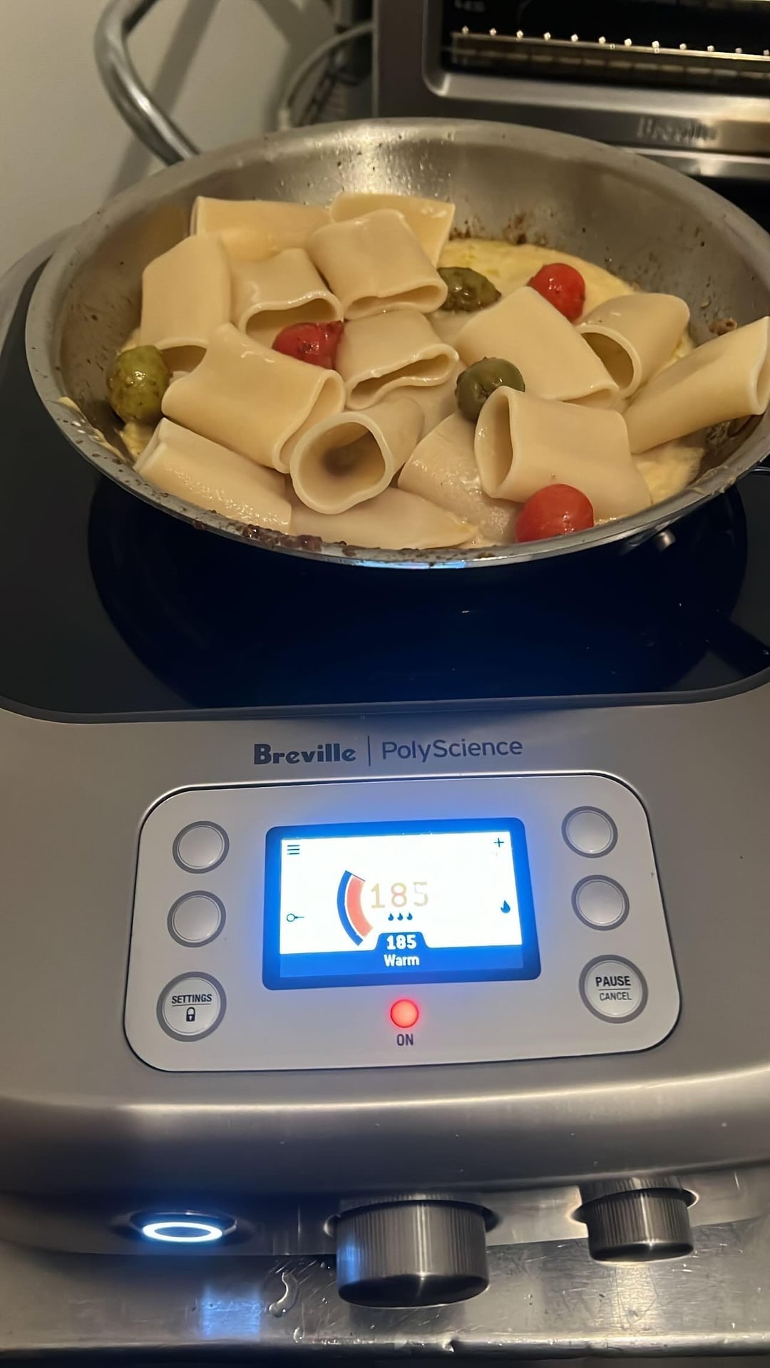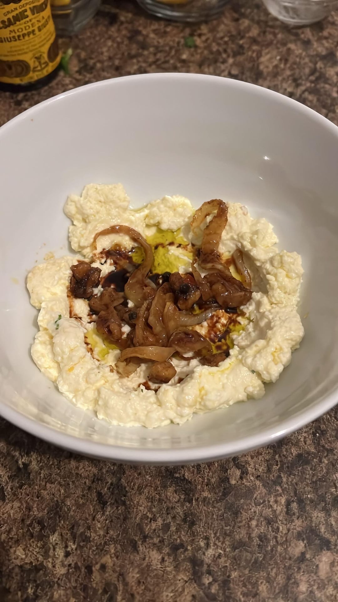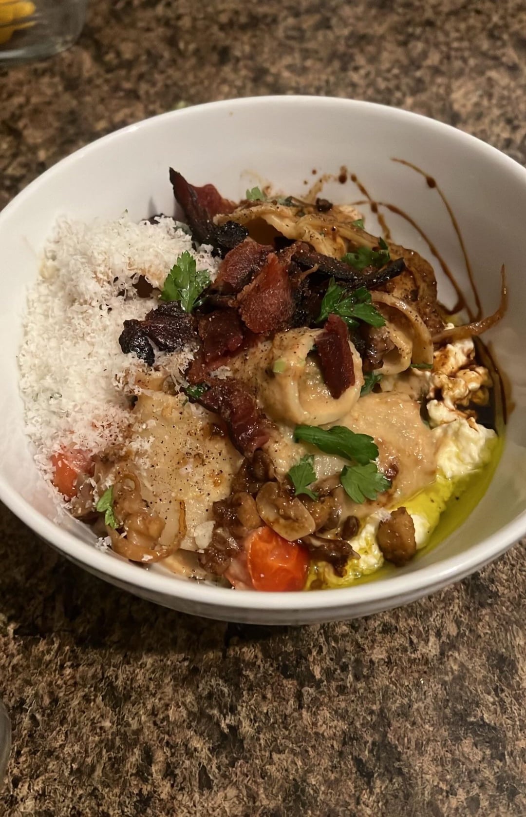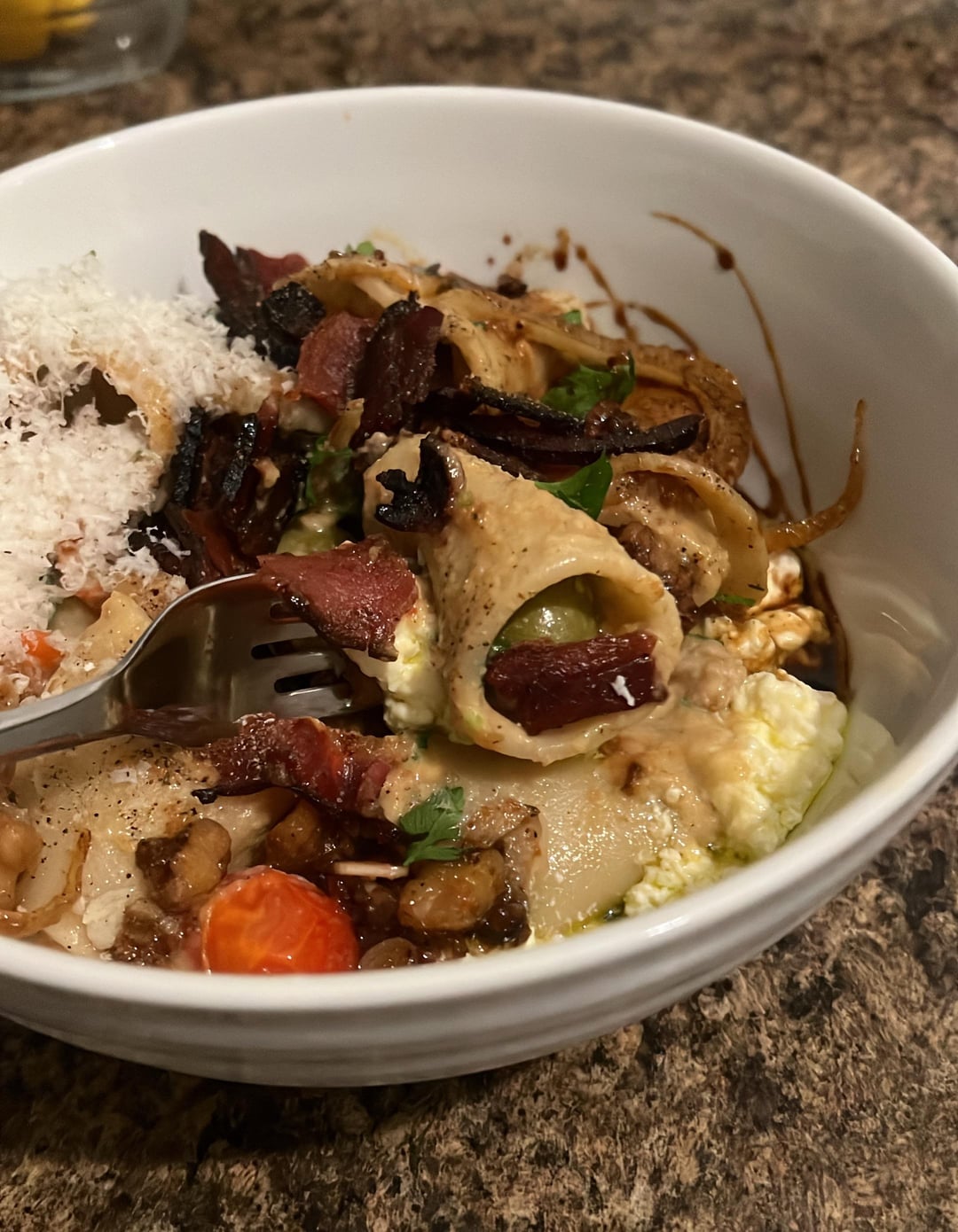 Paccheri pasta with fennel garlic isigny spring butter gochugaru lehua blossom honey burnt shallot sauce with sautéed shallot, flavor bomb cherry tomatoes, garlic stuffed queen olives, walnuts, parsley, thyme, garlic powder, gochugaru, lemon juice, pasta water, fermented peppercorns, Jacobson salt, pepper, and 15 year balsamic with bellwether farms basket ricotta mixed with evoo, balsamic, lemon zest, and yuzu kosho with baked Black Forest bacon bits