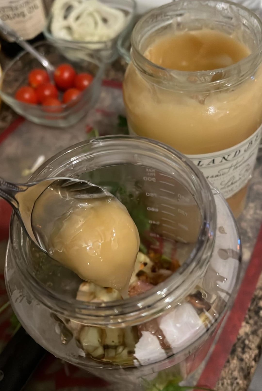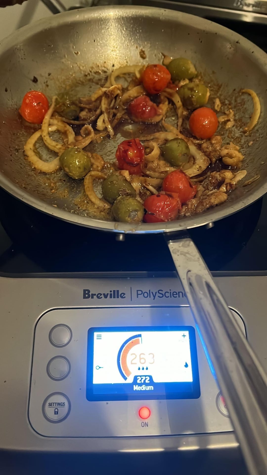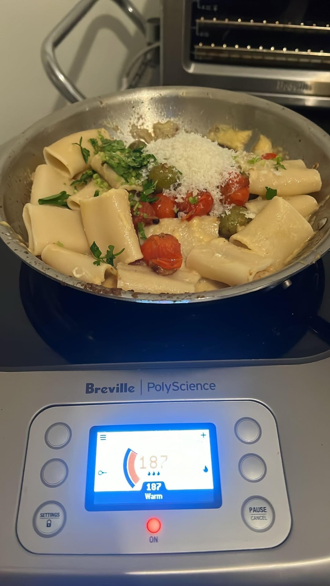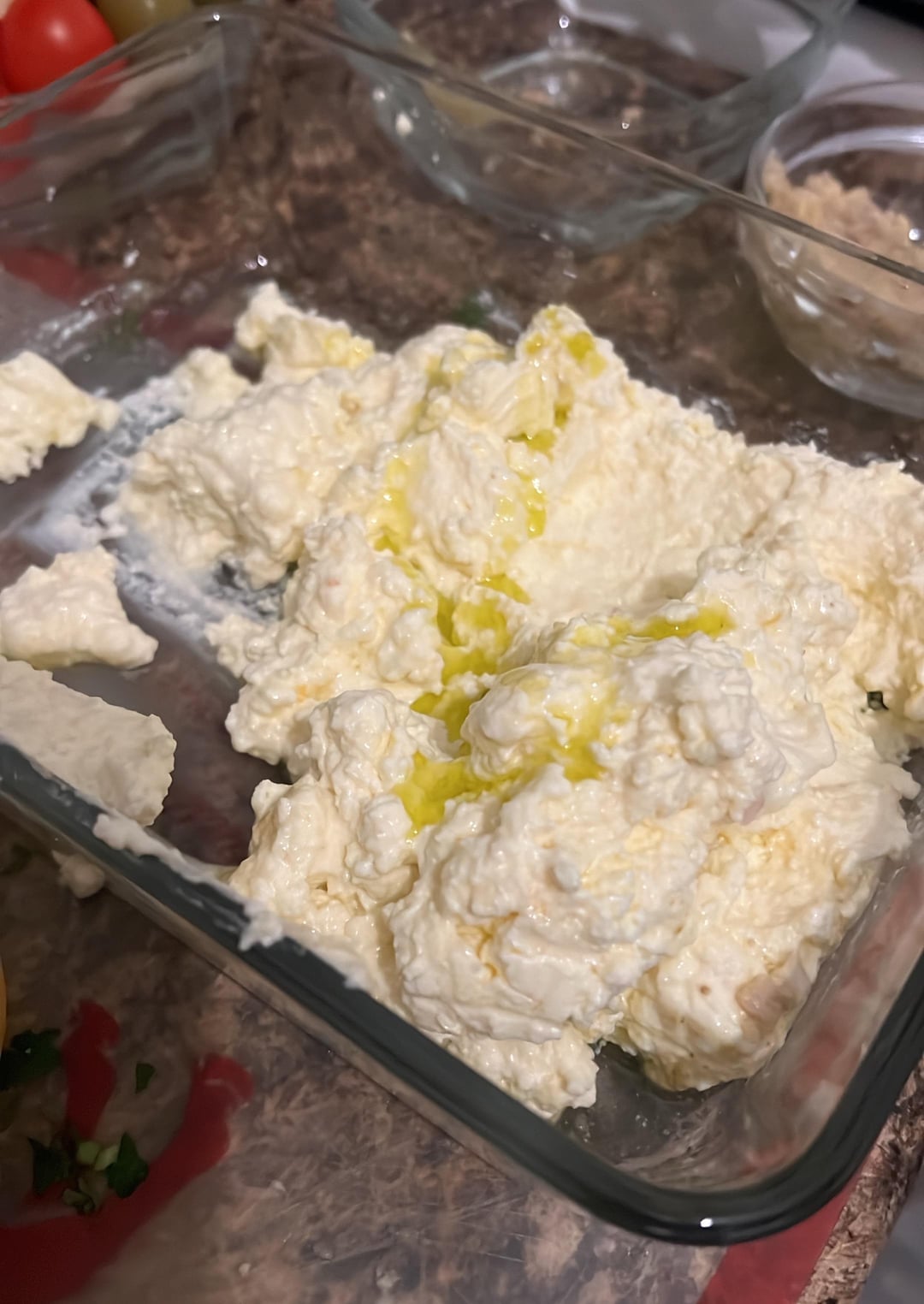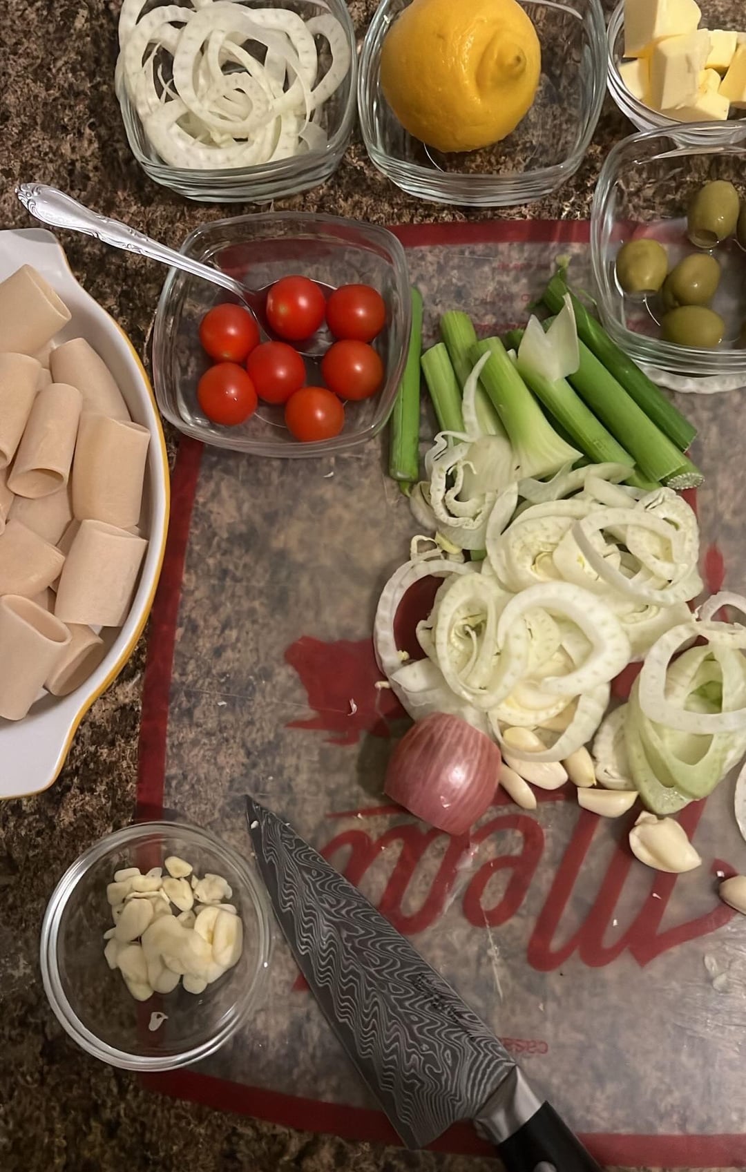 Paccheri pasta with fennel garlic isigny spring butter gochugaru lehua blossom honey burnt shallot sauce with sautéed shallot, flavor bomb cherry tomatoes, garlic stuffed queen olives, walnuts, parsley, thyme, garlic powder, gochugaru, lemon juice, pasta water, fermented peppercorns, Jacobson salt, pepper, and 15 year balsamic with bellwether farms basket ricotta mixed with evoo, balsamic, lemon zest, and yuzu kosho with baked Black Forest bacon bits