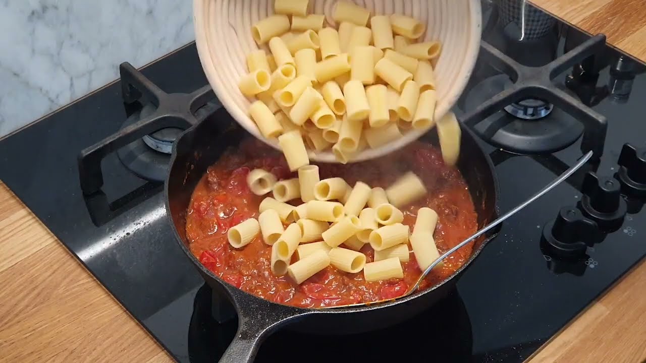 6. PASTA RISOTTATA METHOD: Pour the dry pasta straight into the sauce. Cover it with hot water immediately. Keep stirring the pasta as it absorbs the liquid. Keep stirring it to make sure it doesn’t stick to the bottom of the pan. This constant stirring helps release the starch from the pasta, creating a creamy texture. If necessary, add a little extra hot water.