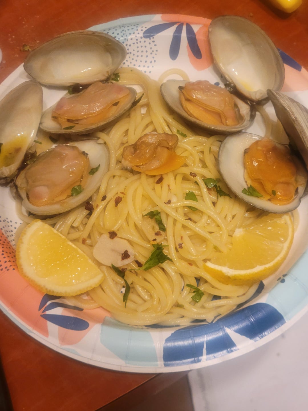 Linguine, white wine, garlic, parsley, chili flakes, clams, extra virgin olive oil, garnished with lemon wedges.by Comprehensive-Ad8905 homemadeitalian foodItalian RecipesWrite A CommentYou must be logged in to post a comment.