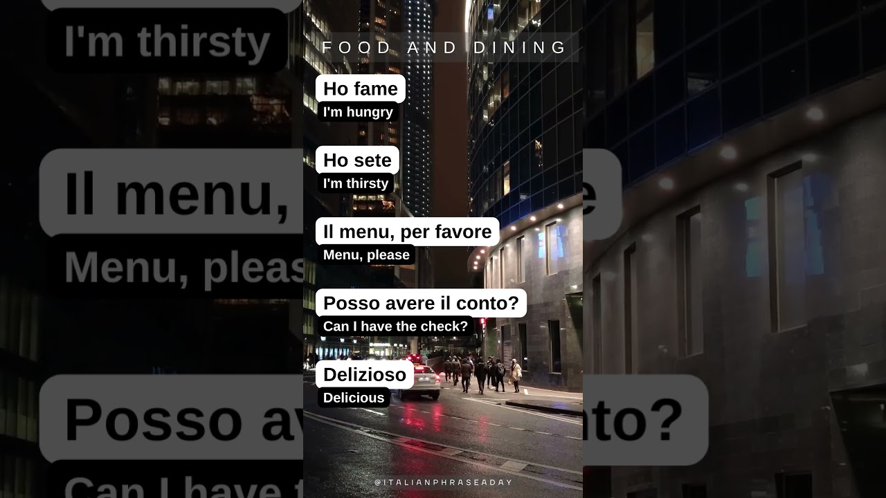 “🇮🇹 Buon appetito! Explore the delicious world of Italian food and dining phrases with Italian Phrase A Day! In this lesson, we’ll cover essential expressions like ‘Ho fame’ (I’m hungry), ‘Il menu, per favore’ (Menu, please), and ‘Delizioso’ (Delicious). Whether you’re dining out in Italy or simply want to impress with your Italian culinary vocabulary, these phrases are a must-know. Get ready to indulge in Italian cuisine and culture!