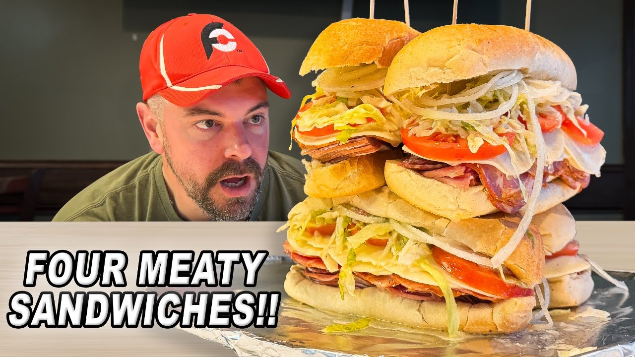 American professional eater Randy Santel versus Caliendo’s “Bada Bing” 2ft-Long Italian Cold Cut Combo Sub Sandwich Challenge, hosted by Caliendo’s Restaurant and Bar in Winfield, Illinois which is a western suburb of Chicago!! I drove down from Milwaukee, Wisconsin and spent four days attempting 4 big and delicious Illinois restaurant food challenges around the western suburbs of the Chicagoland area. For final competitive eating challenge #4 of four, I headed back to Caliendo’s Restaurant and Bar in Winfield which is directly west of Chicago. I was there back in April 2022 for their 5lb “Wise Guy” Italian Calzone Challenge. They offer three different delicious eating challenges at Caliendo’s, and this time I was there to attempt Caliendo’s “Bada Bing” 2ft-Long Italian Cold Cut Trio Combo Submarine Sandwich Challenge which has only been defeated by a few people the past 16-17 years that the challenge has been available. The challenge used to involve an actual 2-foot-long loaf of bread, but now there are four separate 6″ long sandwiches. Each sandwich was made the same, loaded with three delicious Italian cold cut sliced deli meats: capicola, salami, and Mortadella luncheon meat. Each sandwich was also loaded with provolone cheese plus a trio of healthy vegetables: lettuce, white onions, and tomatoes. The sandwiches were topped with Caliendo’s homemade Italian salad dressing and I ordered some on the side too in case I wanted to dip a sandwich in it. 30 minute time limit. I was trying to win my $25 sandwich meal free plus another sweet t-shirt and spot on the Wall of Fame. BIG thanks to everyone with Caliendo’s Restaurant and Bar in Winfield, Illinois for the wonderful food, drinks, and hospitality!! Special thanks also to all our amazing friends who came up that Monday evening to watch and meet me!! We appreciate everyone in the greater Chicagoland area and all around Illinois who watches videos and supports our hard efforts!! The next five videos will feature restaurant food challenges around Western Michigan plus Lansing, and I hope you all enjoy them!!