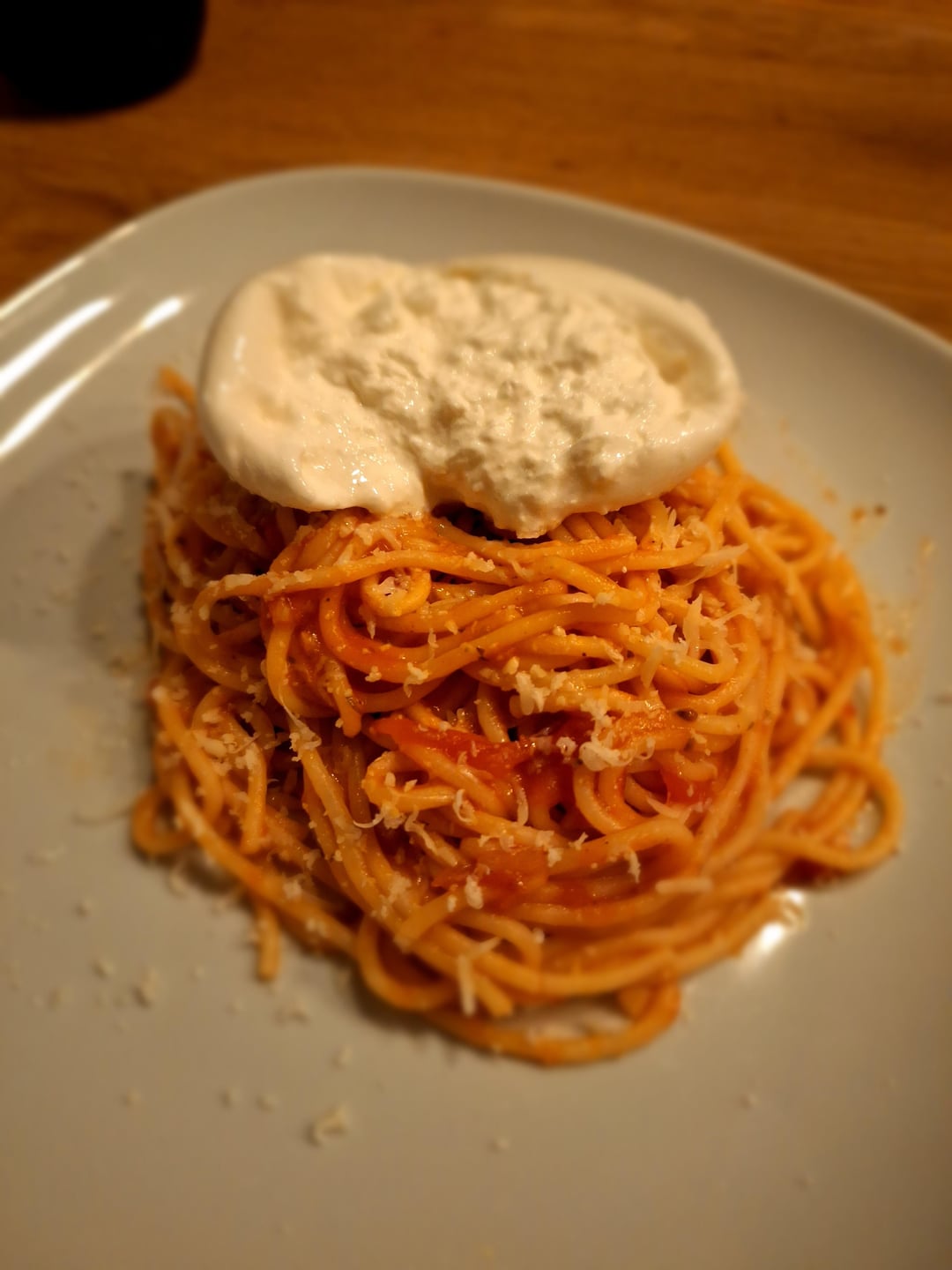 Homemade spaghetti with a tomatosauce and a burrata on top.