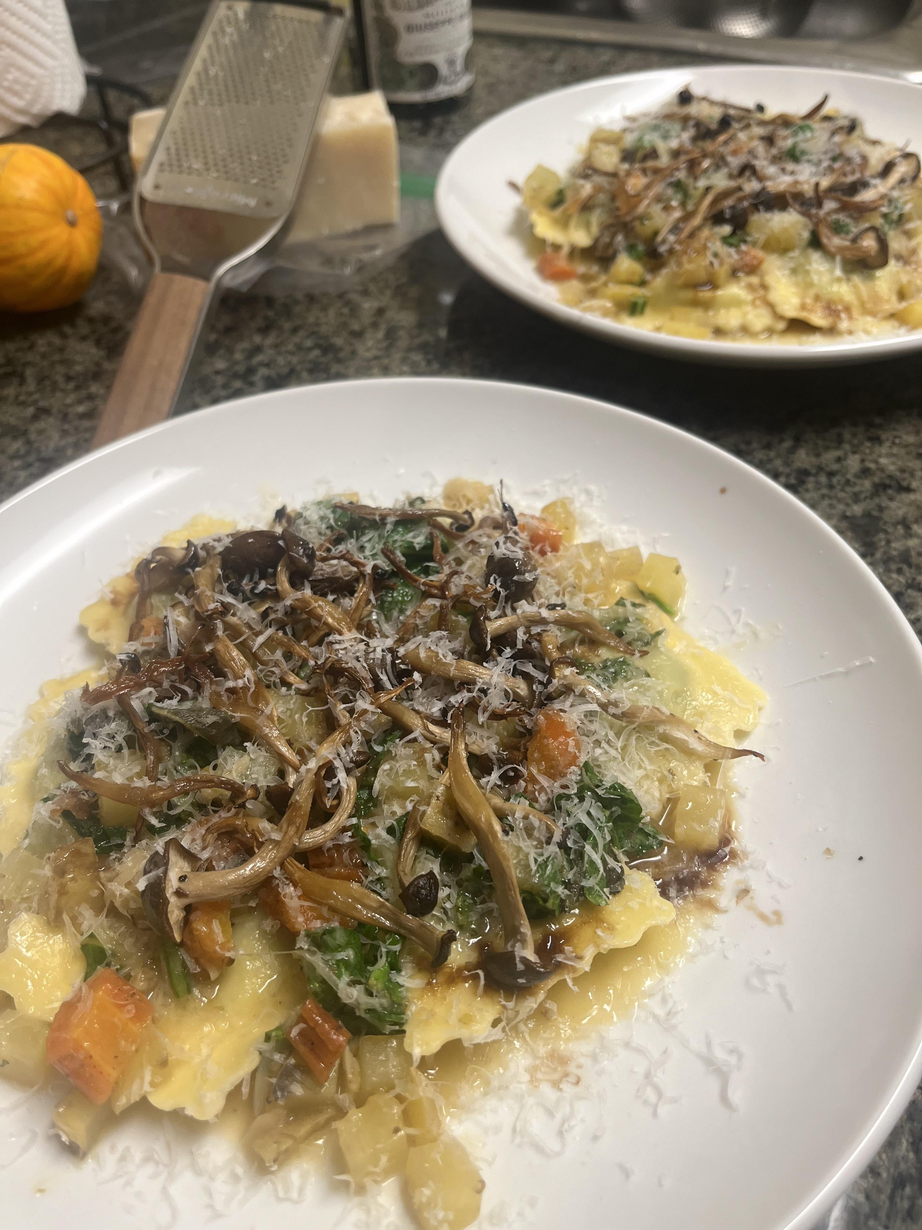 Rana spinach and ricotta ravioli, roasted carrot, Yukon gold potato, Dino kale, yellow onion, roasted garlic, vermentino butter sage sauce. Topped with dehydrated clamshell mushrooms, finished with parmigiano and aged balsamicby Kalikokola Homemade DishPastaWrite A CommentYou must be logged in to post a comment.