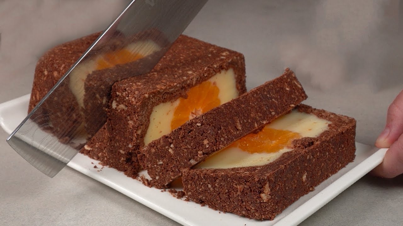 Hello friends 9 wafer sheets Butter 1.4 oz (40gr) Dark chocolate 5.3 oz (150gr) Sour cream 1.4 oz (40gr) Mold 5″x 7″ (18x12cm) 2 eggs Vanilla sugar 0.4 oz (10gr) Sugar 3.5 oz (100gr) Flour 1.6 oz (40gr) Milk 22 fl oz (650ml) Gelatine 0.8 oz (24gr) Water 1.7 fl oz (50ml) 5 tangerines