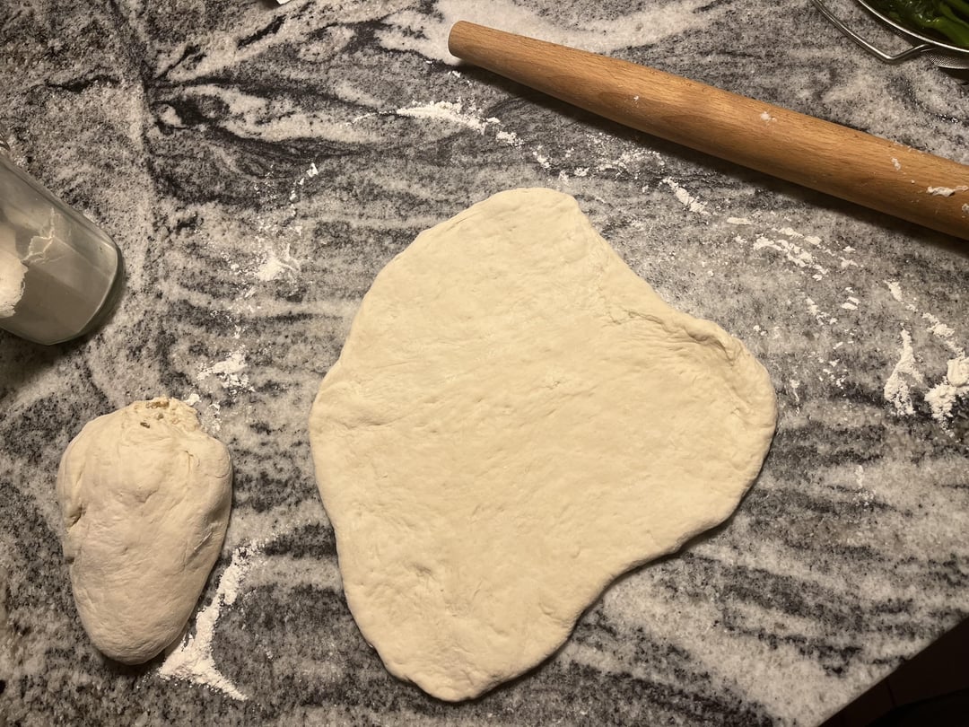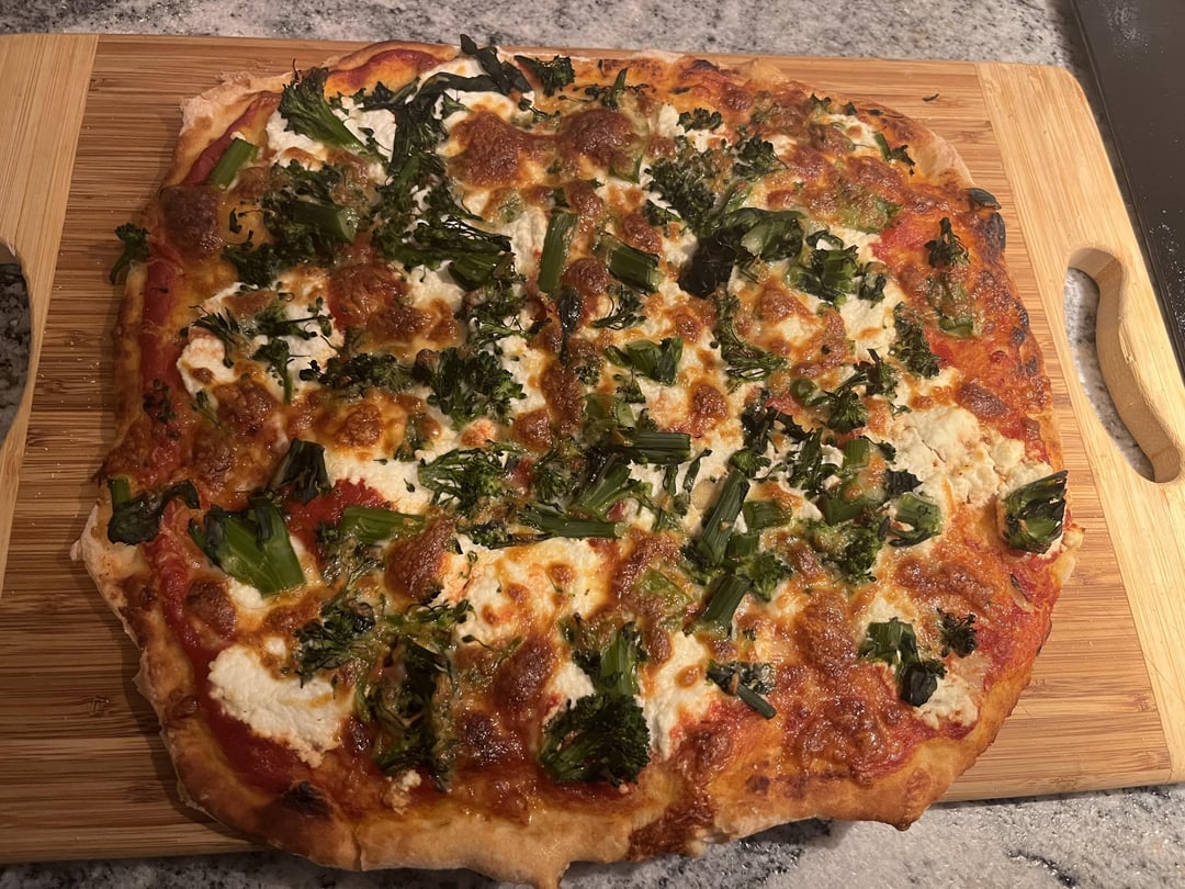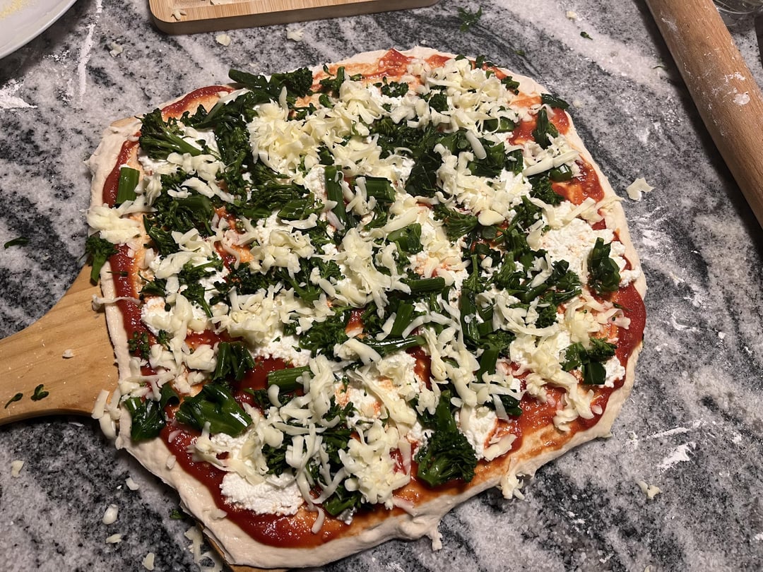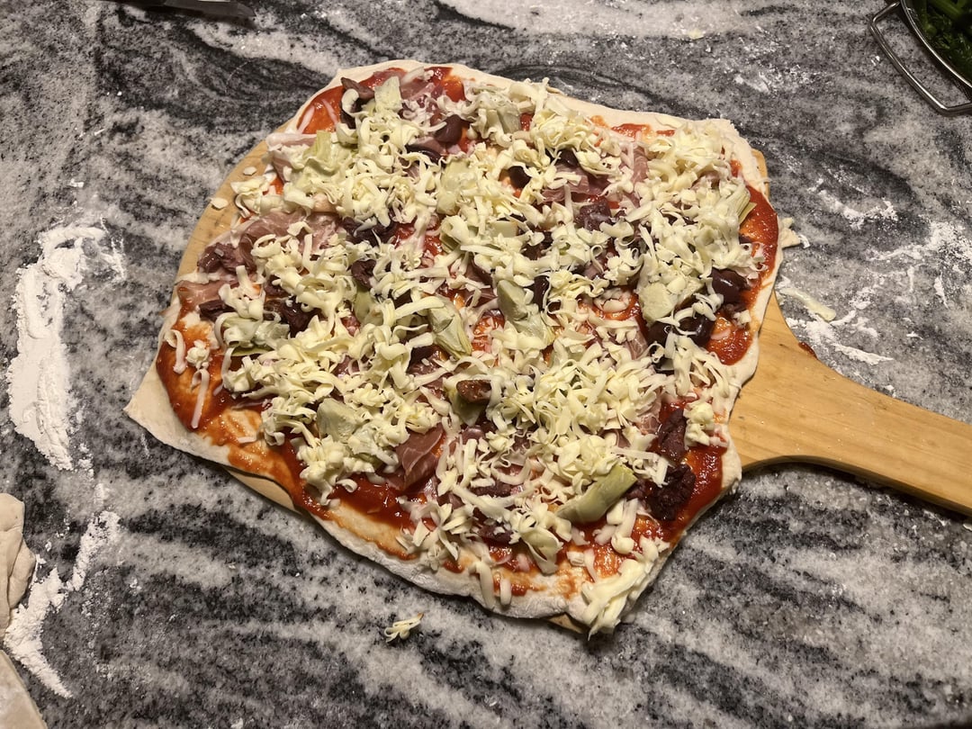 Pizza 1 is artichoke, prosciutto, olives, and mozzarella. . Pizza 2 is rapini, ricotta, and mozzarella.