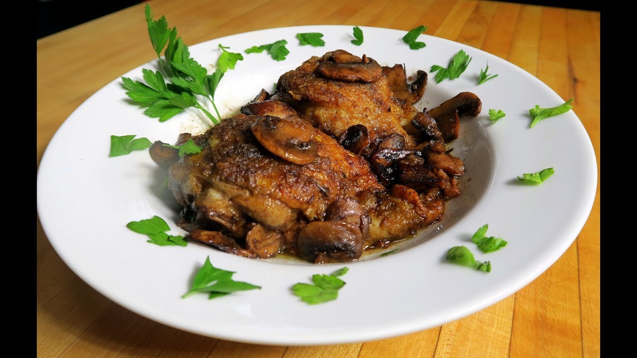 Return chicken to the pan and add the vinegar and wine. Let simmer for about 10 min. Transfer to baking dish to the oven allow liquid to reduce by half and becomes syrupy. We baked uncovered for 30 min, it could be less in your oven so make sure internal temp of chicken is 180 degrees.